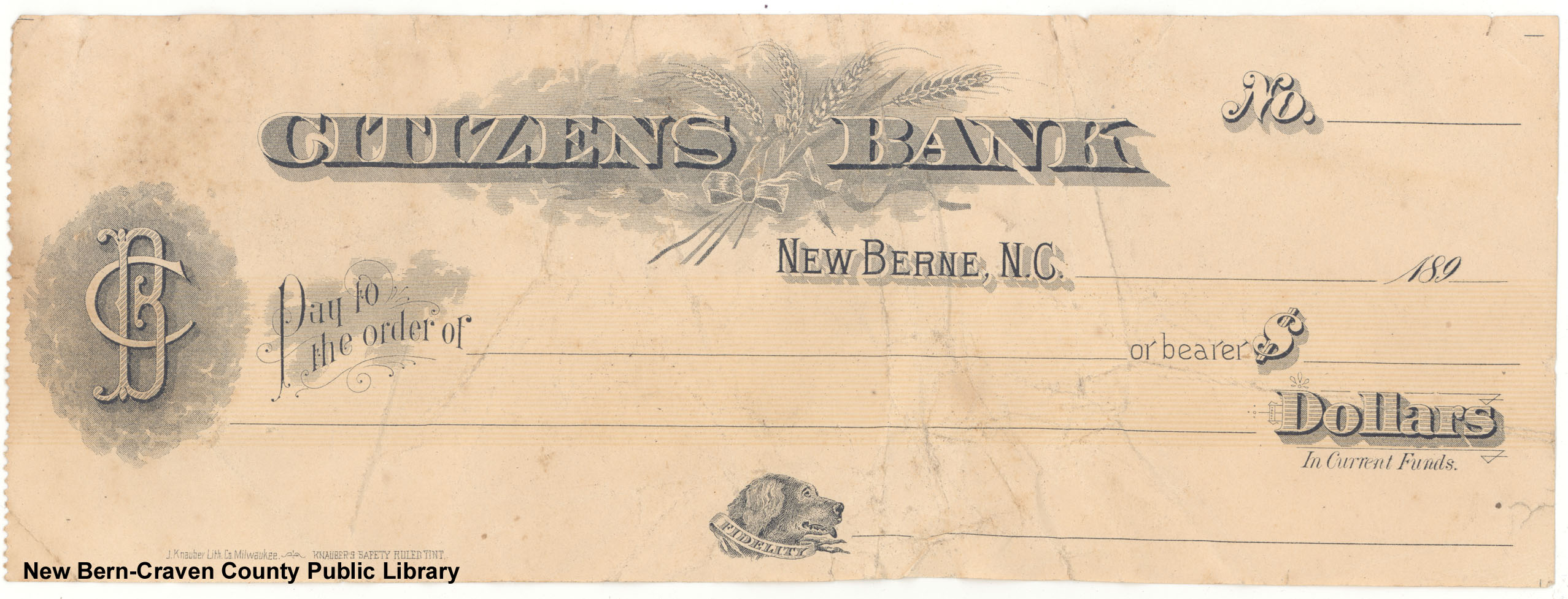 A blank check from Citizens Bank, New Berne, N.C., showing vignettes of heads of wheat and a dog's head.