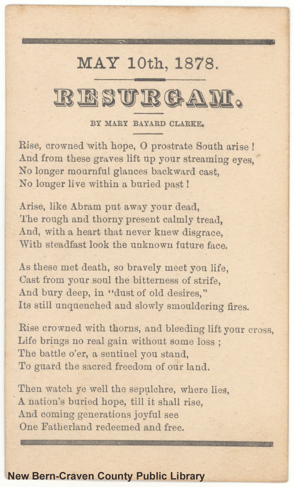 Clarke, Mary Bayard, 1827-1886, “Resurgam by Mary Bayard Clarke,” Craven County Digital History, accessed October 9, 2025, https://kellenberger.mycprl.org/digital/items/show/1127.
