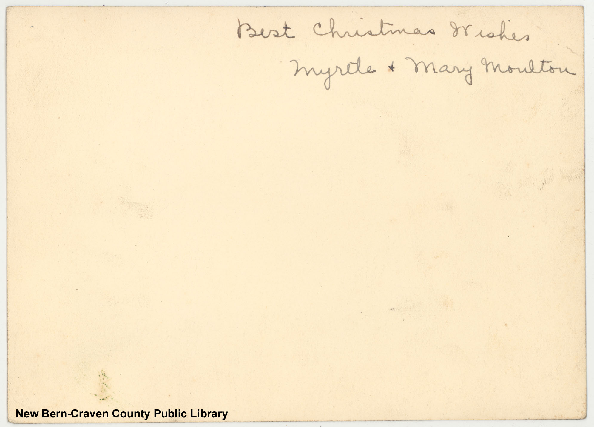A photograph of the view of the Neuse River from East Front Street. Seen in the middle of the image is the Neuse River Bridge from Johnson Street to Bridgeton. Wootten-Moulton photographed the image. On the back of the image, Myrtle and Mary Moulton send their "best Christmas wishes".