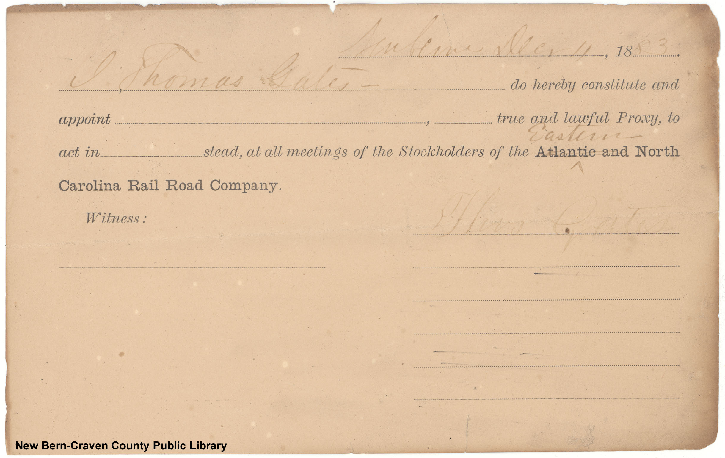 Gates, Thomas, “Eastern North Carolina Railroad Company proxy document,” Craven County Digital History, accessed October 9, 2025, https://kellenberger.mycprl.org/digital/items/show/1134.