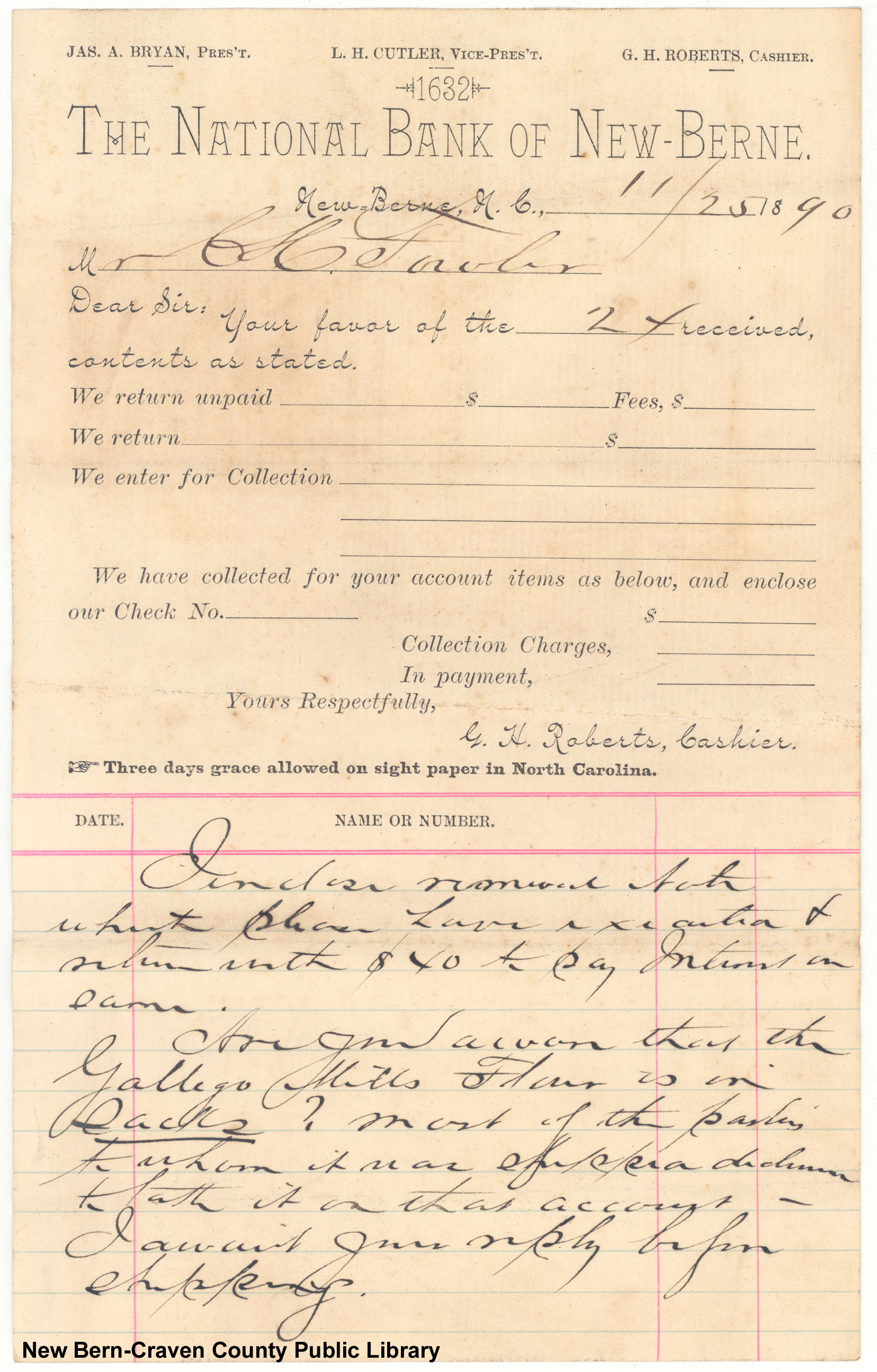The National Bank of New-Berne collection note with G.H. Roberts' printed signature.