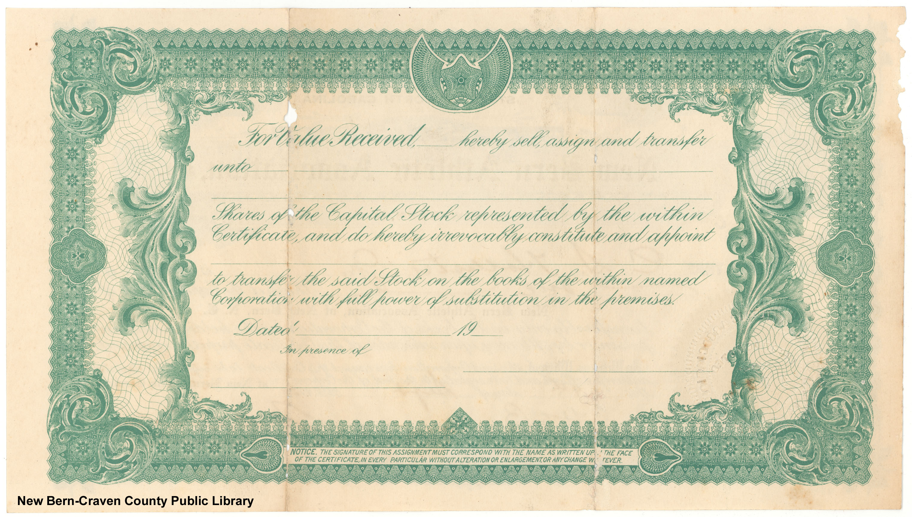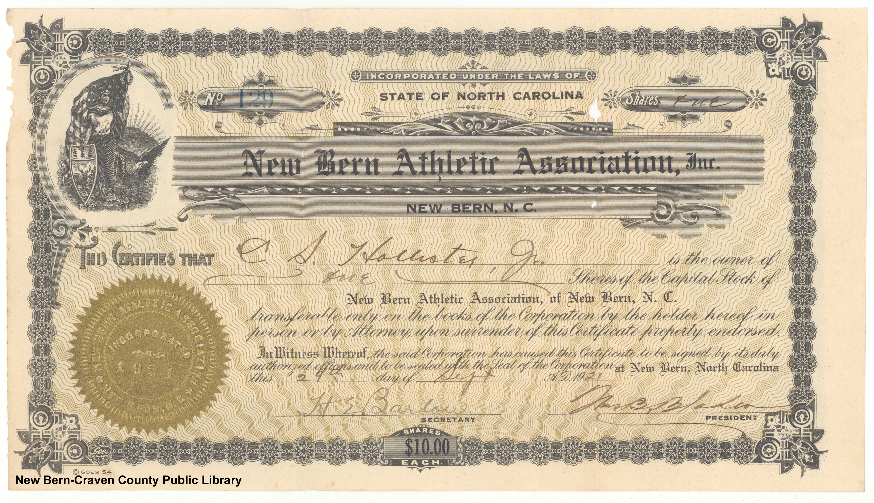 New Bern Athletic Association (New Bern, N.C.), “Stock Certificate for one share New Bern Athletic Association,” Craven County Digital History, accessed October 9, 2025, https://kellenberger.mycprl.org/digital/items/show/1150.