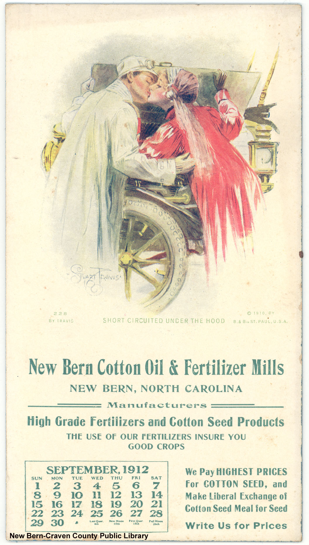 A calendar for the New Bern Cotton Oil and Fertilizer Company issued in 1912 depicts a couple kissing while checking under the hood of their vehicle that was drawn in 1910. Under the picture there is a line that states "short circuited under the hood." The calendar is for the month of September, 1912.