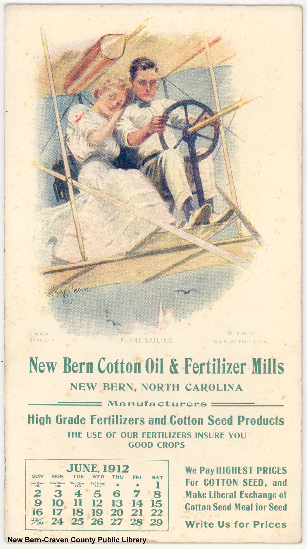 A calendar for the New Bern Cotton Oil and Fertilizer Mills depicts a young woman leaning lovingly on a young man's shoulder while on an airplane. The saying for this calendar says "stooping to conquer." The portrait was drawn in 1910 and the calendar is for June of 1912.