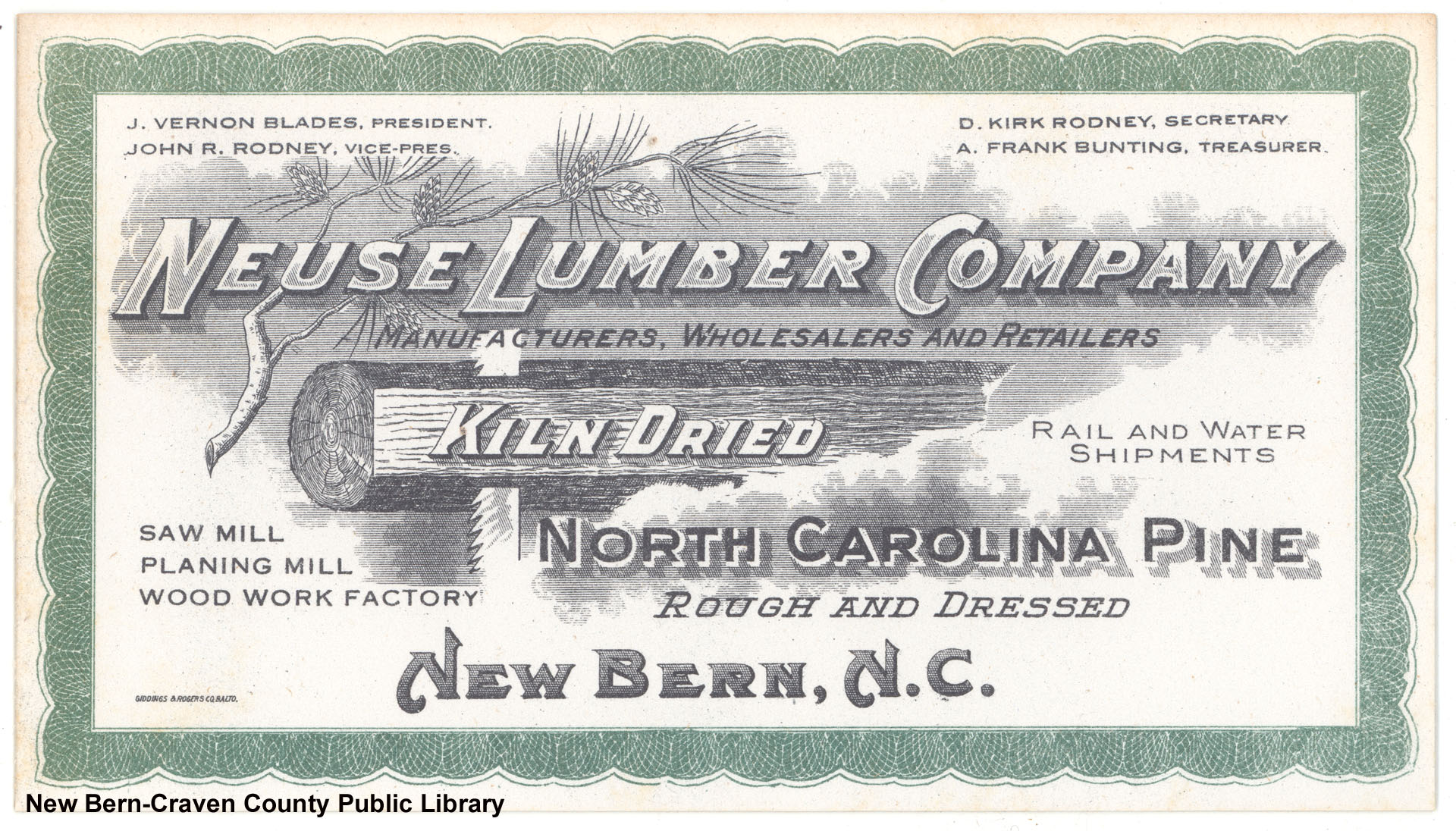The Neuse Lumber Company was owned by the Blades family in the early twentieth century. James Vernon Blades is depicted here as the president of the lumber company at the time. Neuse Lumber Company does not show up in the New Bern business directory until 1910.