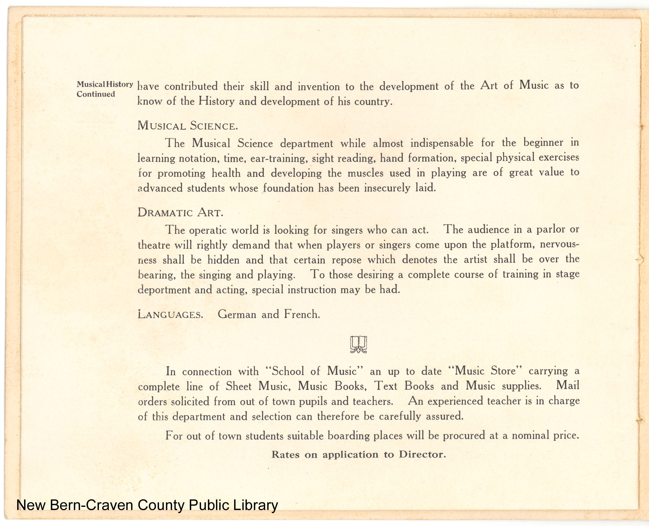 Musical History Continued MUSICAL SCIENCE. DRAMATIC ART. LANGUAGES. German and French. In connection with "School of Music" an up to date "Music