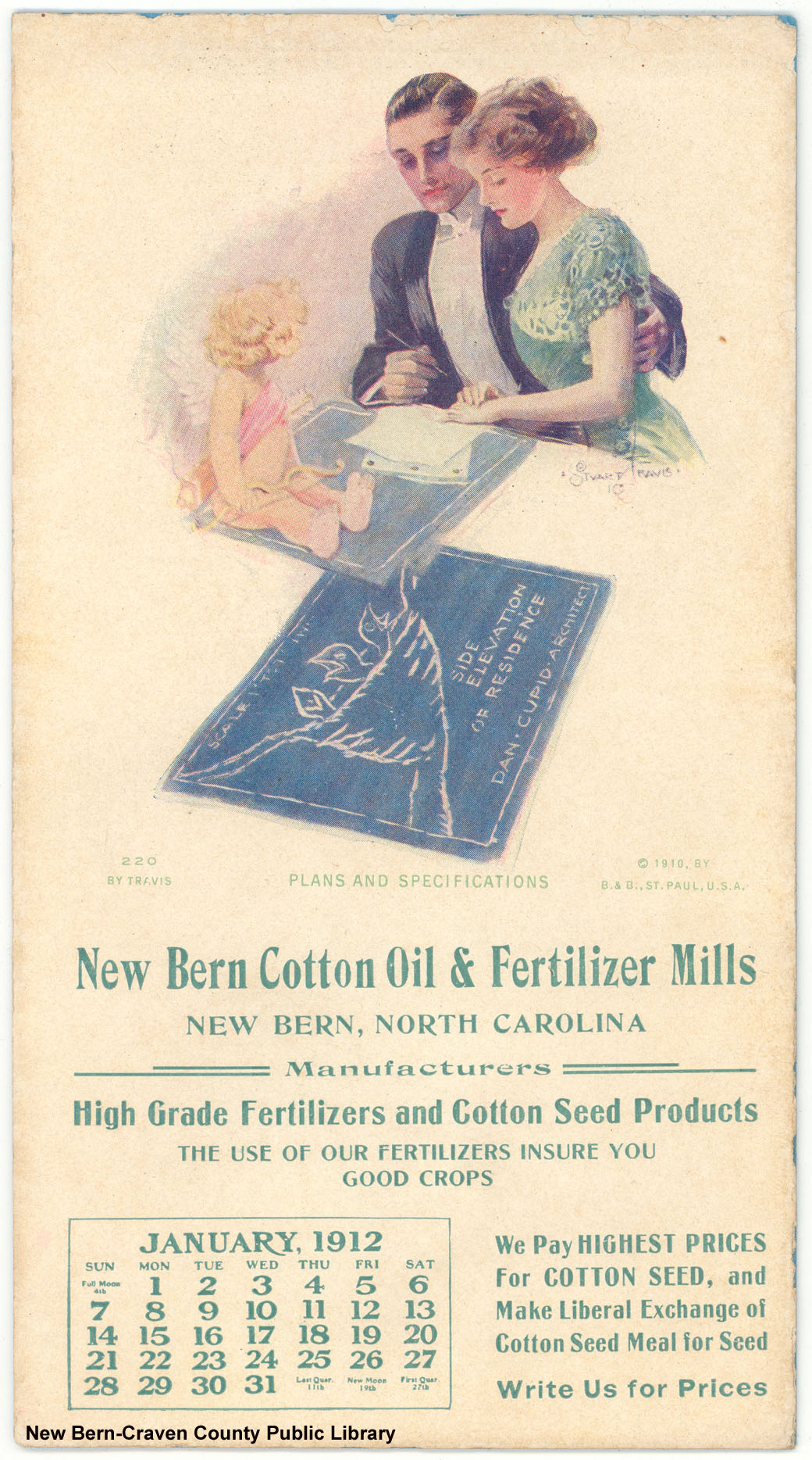A calendar for the New Bern Cotton Oil and Fertilizer Mills depicts a young couple looking over plans and blueprints with a feminine cupid onlooking their plans. The saying for this calendar says "plans and specifications." The portrait was drawn in 1910 and the calendar is for January of 1912.