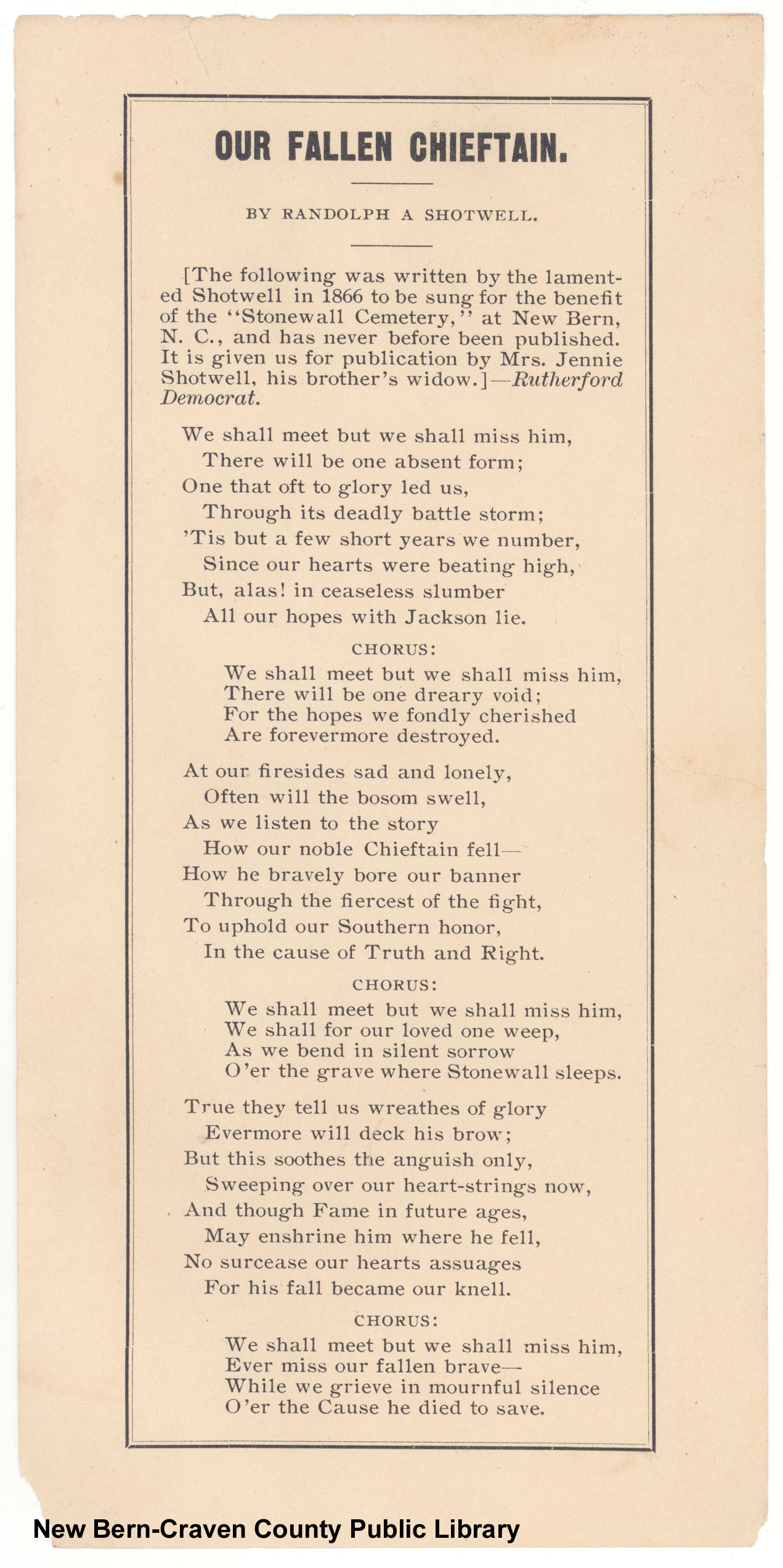 A version of the poem, titled "We Shall Meet, but We Shall Miss Him -- a paraphrase of 'The Vacant Chair,'" by Shotwell was published in the August 26, 1866, issue of the Newbern Daily Times. It was published again in the October 20, 1873, issue of The Southern Home under the title "A Dirge for Jackson; Adapted from a familiar song and tune--'The Vacant Chair.'" By May 1895, it was published in several North Carolina newspapers, including The [New Bern] Daily Journal of May 31, 1895, under the title "The Fallen Chieftain" or "Our Fallen Chieftain."