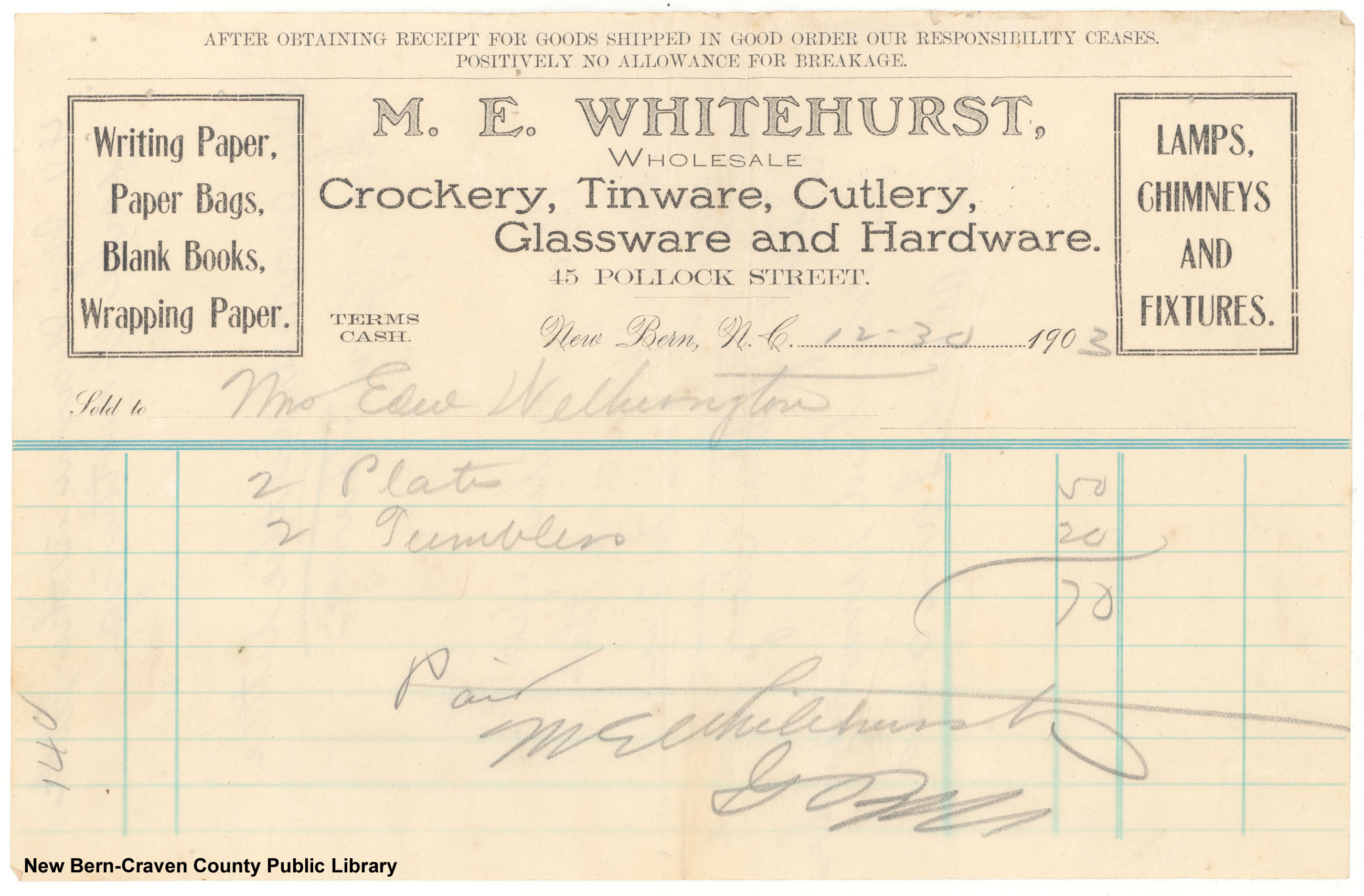 Whitehurst, M. E. (Moses E.), “Billhead, M.E. Whitehurst, Wholesale,” Craven County Digital History, accessed October 8, 2025, https://www.kellenberger.mycprl.org/digital/items/show/1175.
