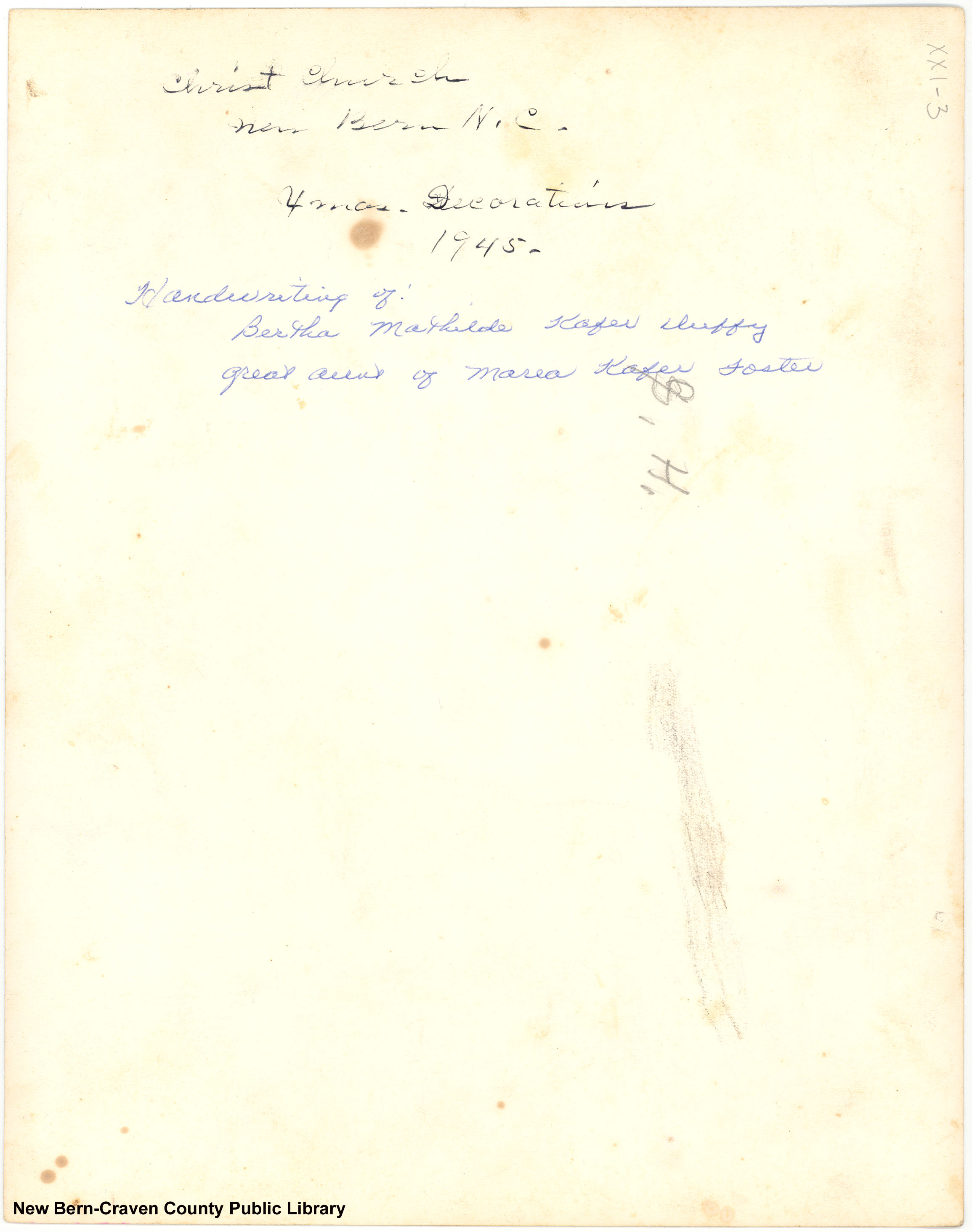Kafer, Bertha Mathilda, “Photo, Interior "Xmas Decorations, 1945",” Craven County Digital History, accessed October 8, 2025, https://www.kellenberger.mycprl.org/digital/items/show/1244.