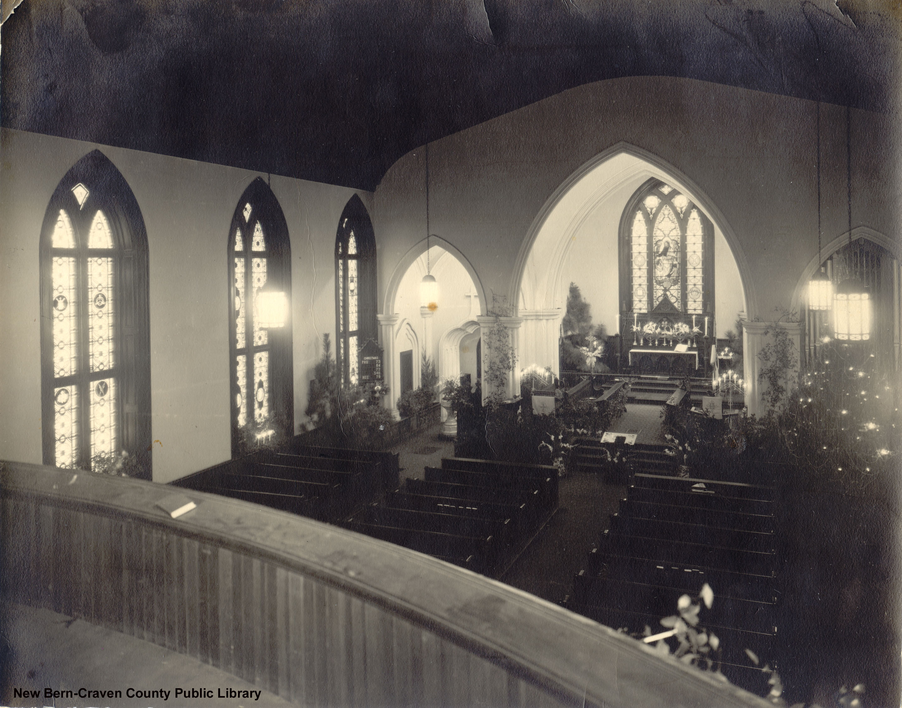 Photograph of Christ Episcopal Church Sanctuary decorated for Christmas in 1945.