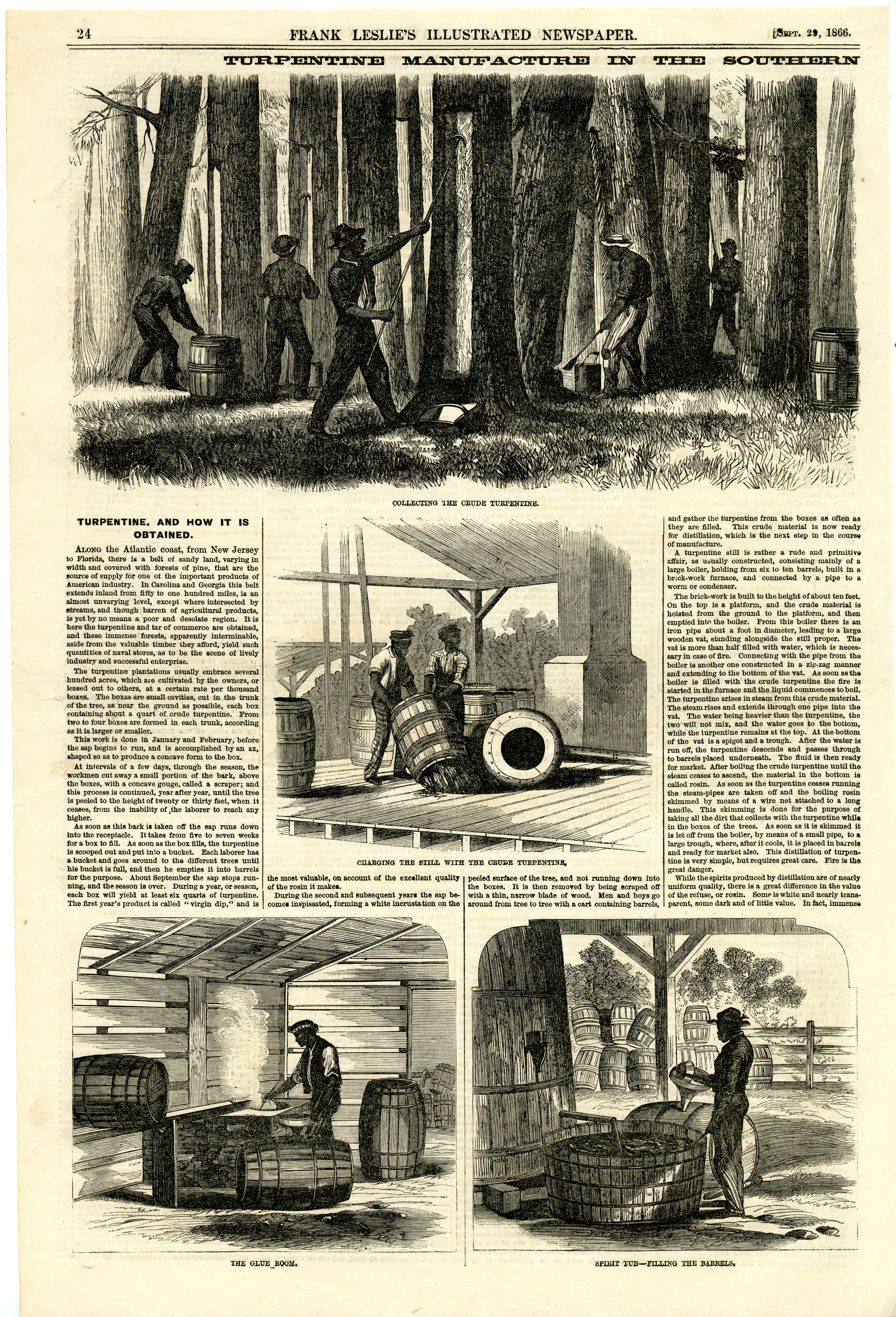 An article on how turpentine and rosin are collected to be distributed after the Civil War. The turpentine business was lucrative in Eastern North Carolina and Georgia. The article includes illustrations of workers collecting and processing the turpentine.