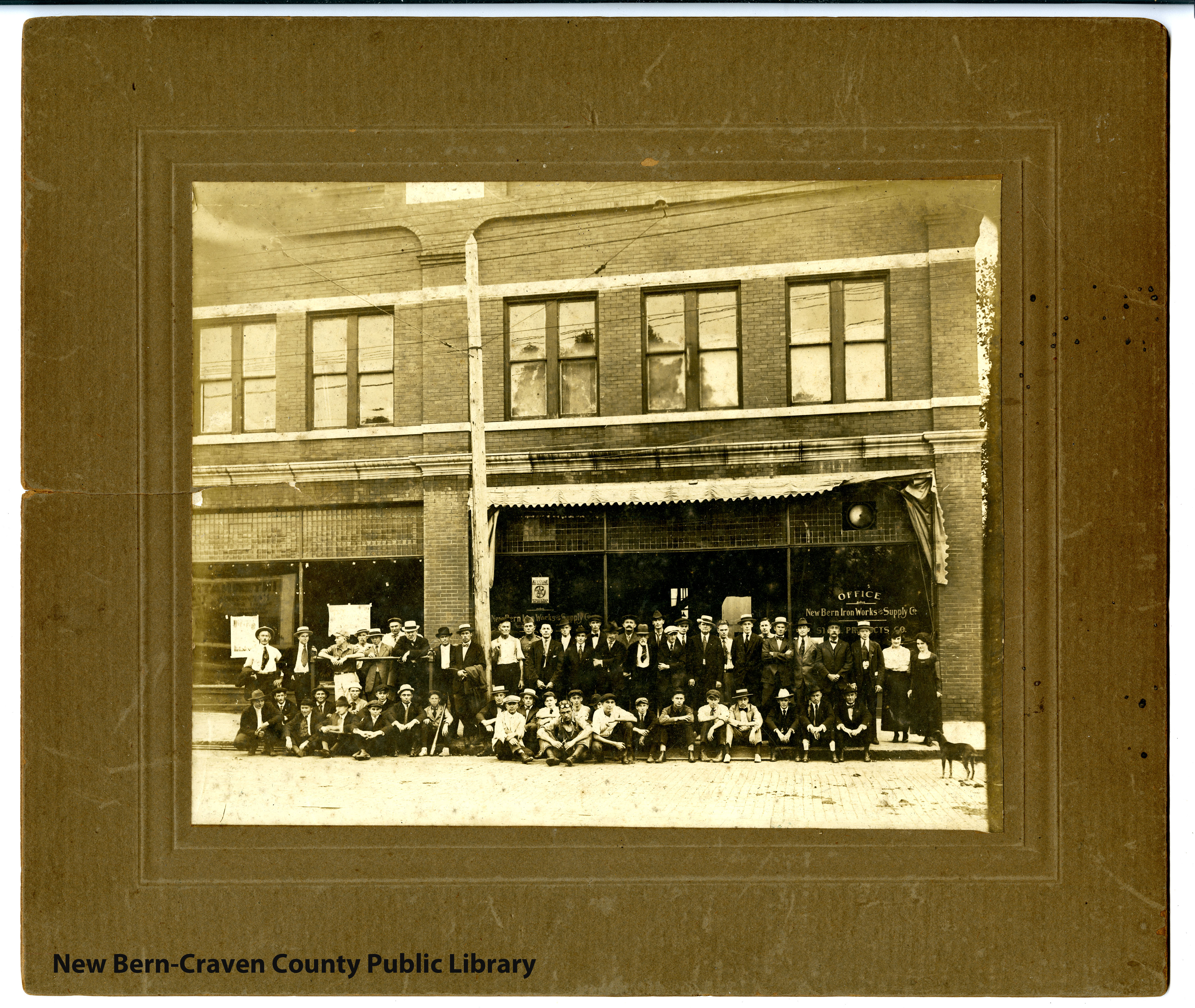 A photograph of the staff at the New Bern Iron Works and Supply Company. The company officially established in 1905 off of Craven Street was expanded next door to a warehouse as well in 1912 due to growth in business.