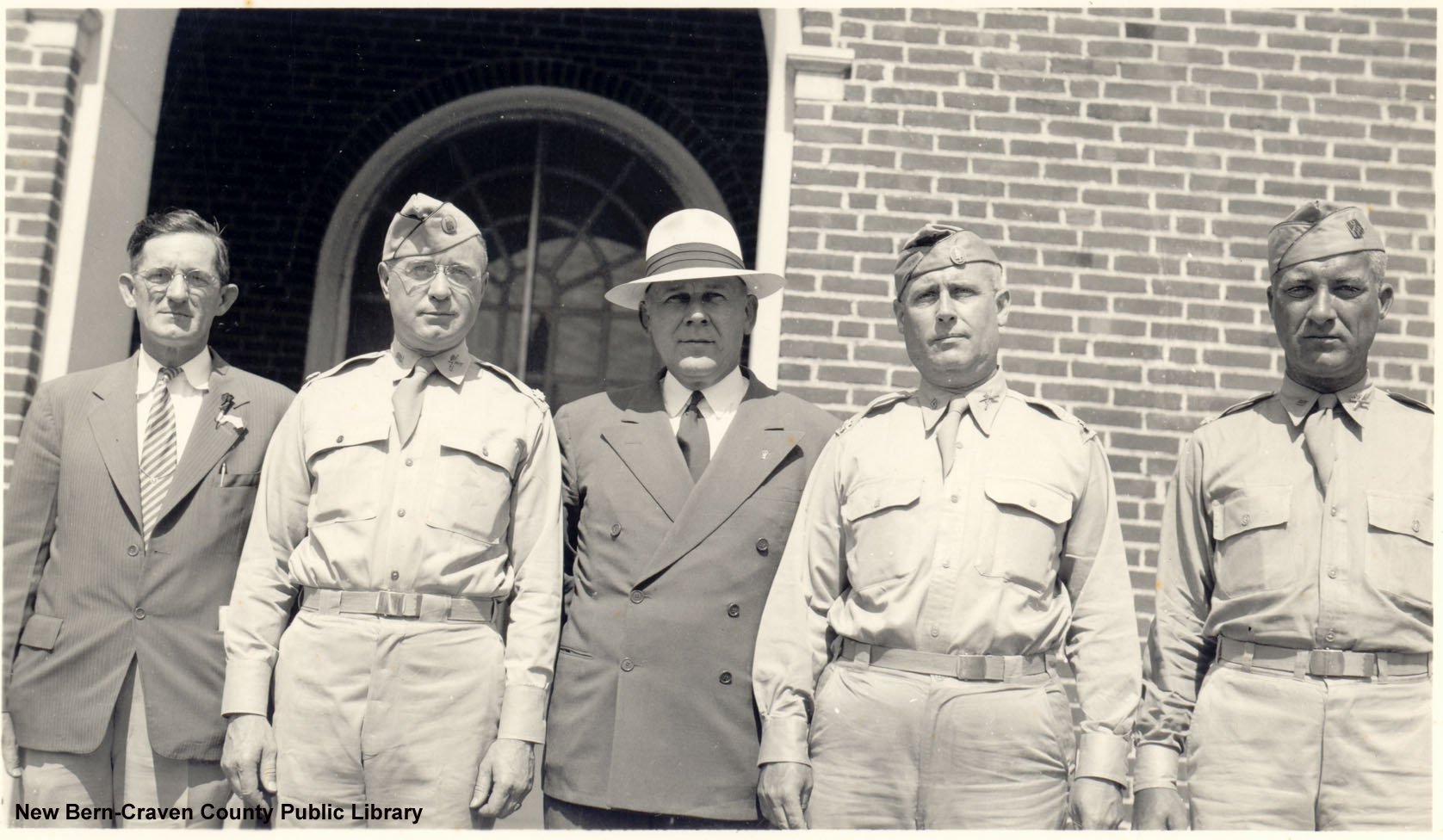 United States Representative Graham A. Barden (center) and Lieutenant Colonel Wilson H. Stephenson (second from left) with three unidentified men, two in uniform, standing in front of the United States Post Office and Court House.