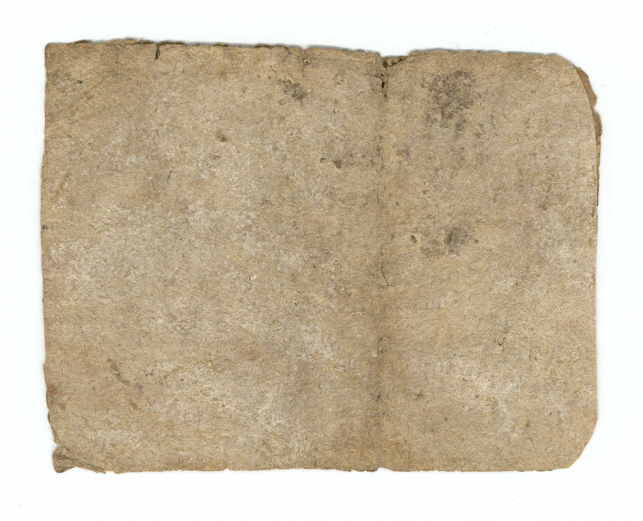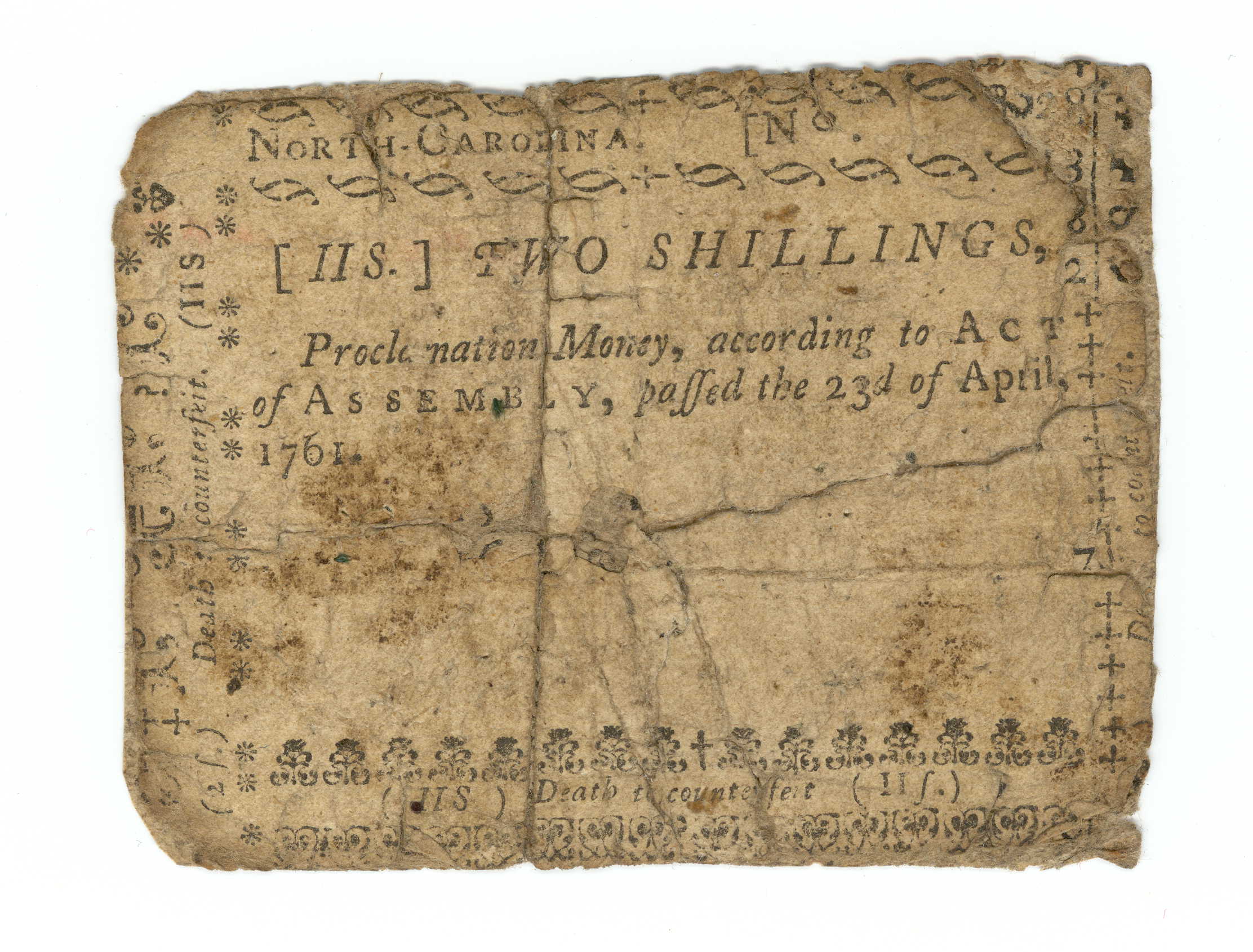 Typeset Bill of Credit issued by North Carolina with borders on the sides and bottom, each with the inscription “Death to counterfeit.” Printed inscription: “North Carolina. No [illegible]/ [ii s.] two shillings,/ Proclamation Money, according to Act/ of Assembly, passed the 23d of April/ 1761/ ( ii s) Death to counterfeit (ii s.)” Bill is heavily discolored and the ink number and signatures are illegible. The bill was signed by John Swann, Samuel Swann, John Starkey and Lewis DeRosset. Bill has been attached to another piece of paper for stability. Bill folded on one vertical and one horizontal crease.