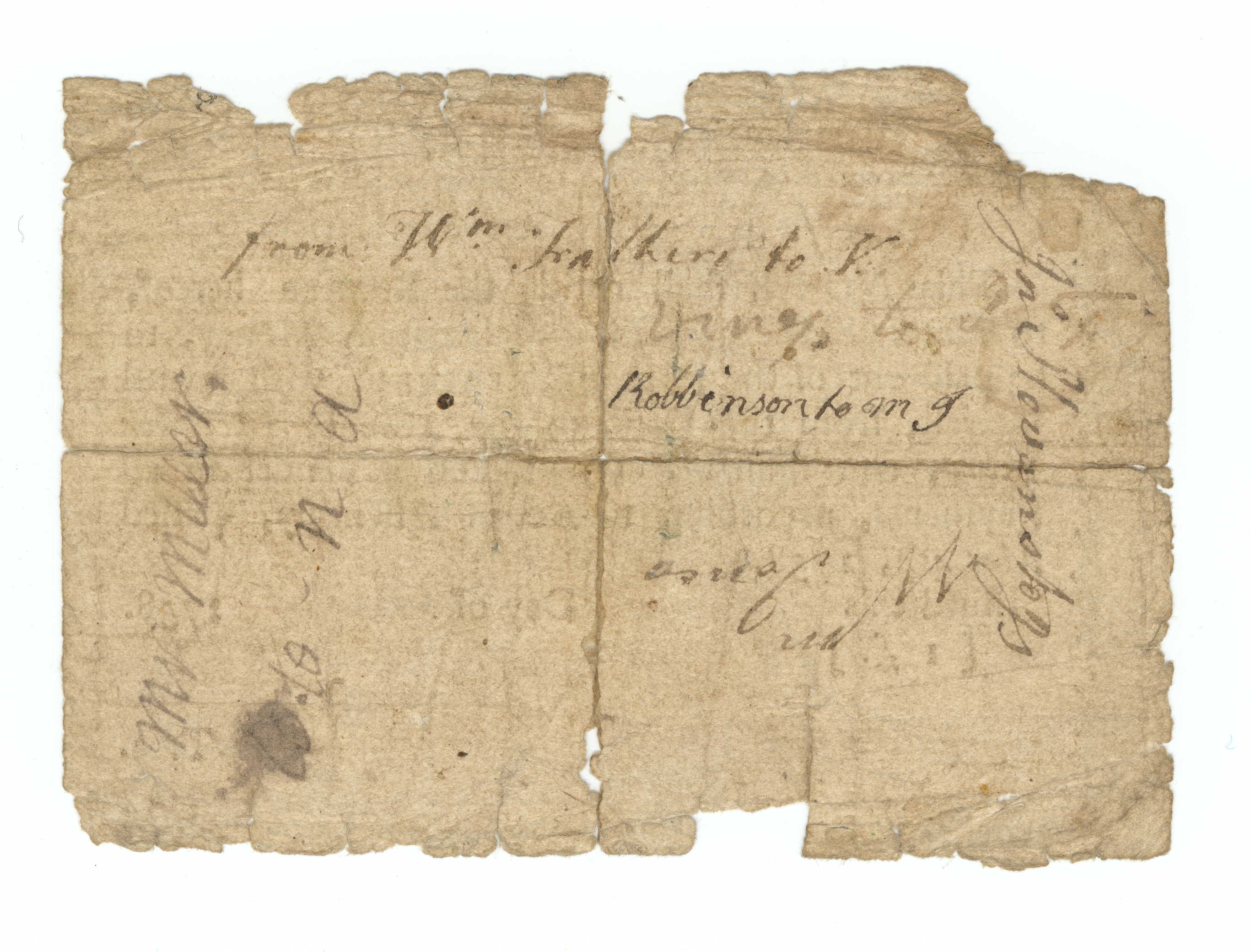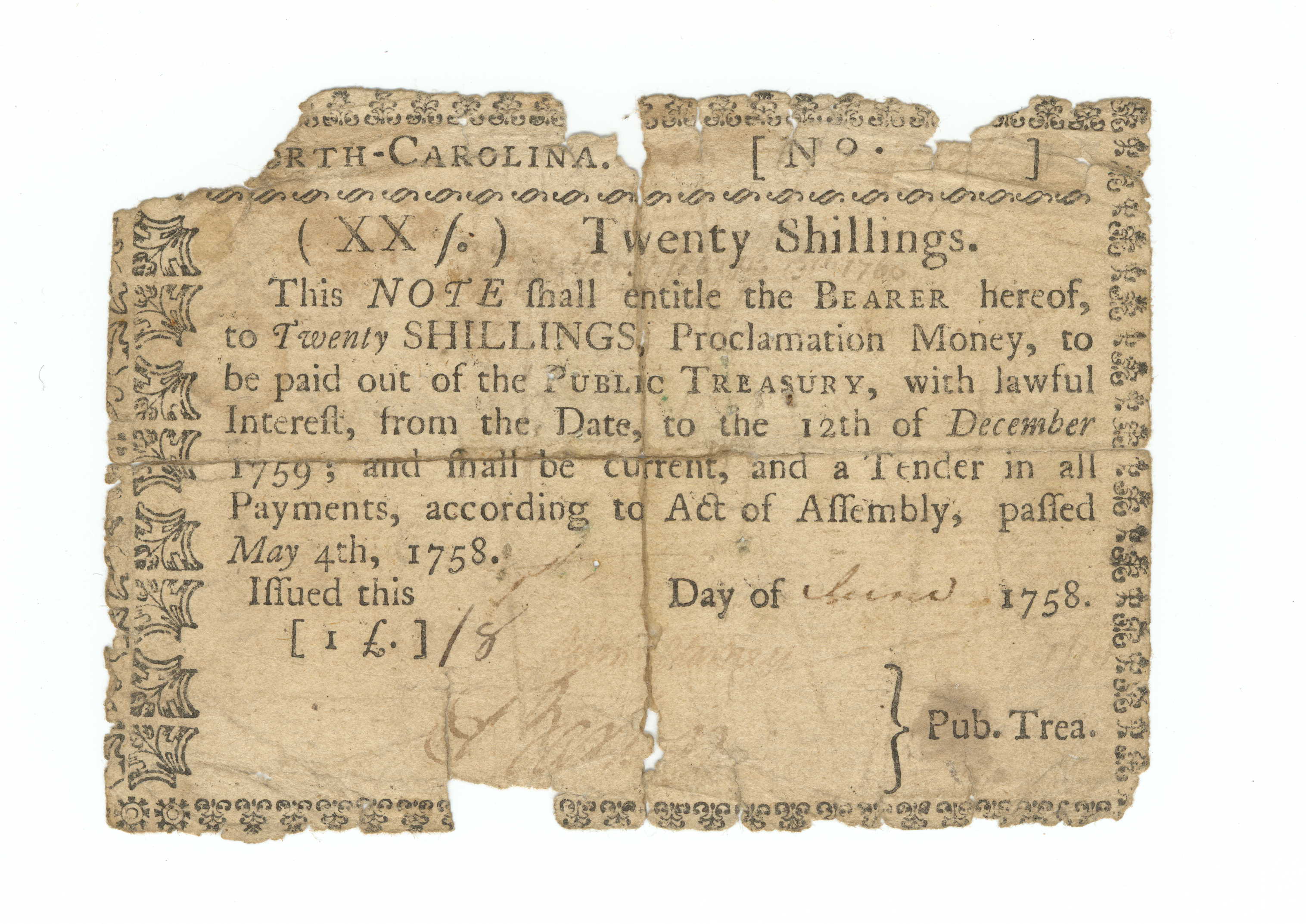 Twenty-shilling Treasury note issued by North Carolina with narrow borders on all four sides. Printed inscription: “North-Carolina./ [ XX s.] Twenty Shillings./ This NOTE shall entitle the Bearer hereof,/ to Twenty SHILLINGS Proclamation Money, to/ be paid out of the Public Treasury, with lawful/ Interest, from the Date, to the 12th of December/ 1759; and shall be current, and a Tender in all/ Payments, according to Act of Assembly, passed/ May 4th, 1758. Issued this [illegible] Day of June 1758./ [ 1 £ ]/ /8 John Sharkey and T Baker Pub. Trea. (Inked-in information underlined.) Illegible serial number in upper right corner. Ink inscriptions on the reverse: “Mr Miller/ to N A,” “from W’m Falher (?) to V,” “Robbinson to m J,” Jno Stevans to JS,” and “Wm Jones.” Bill folded in half in both directions.
