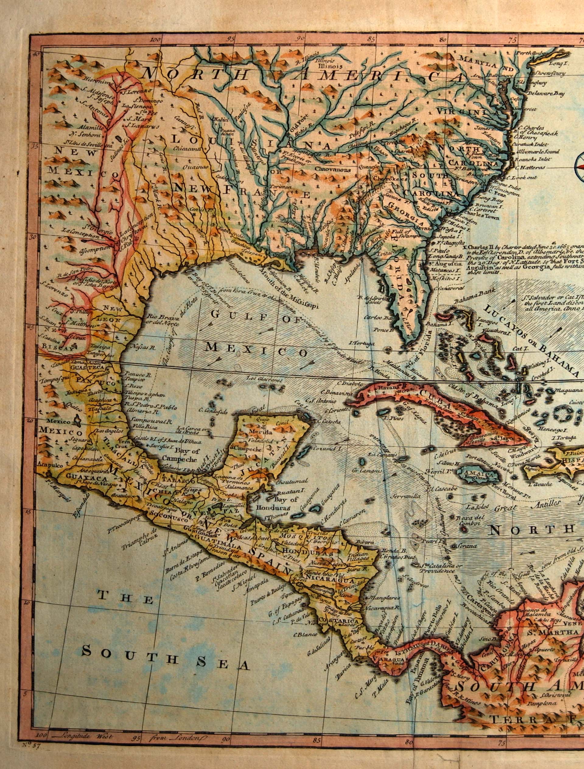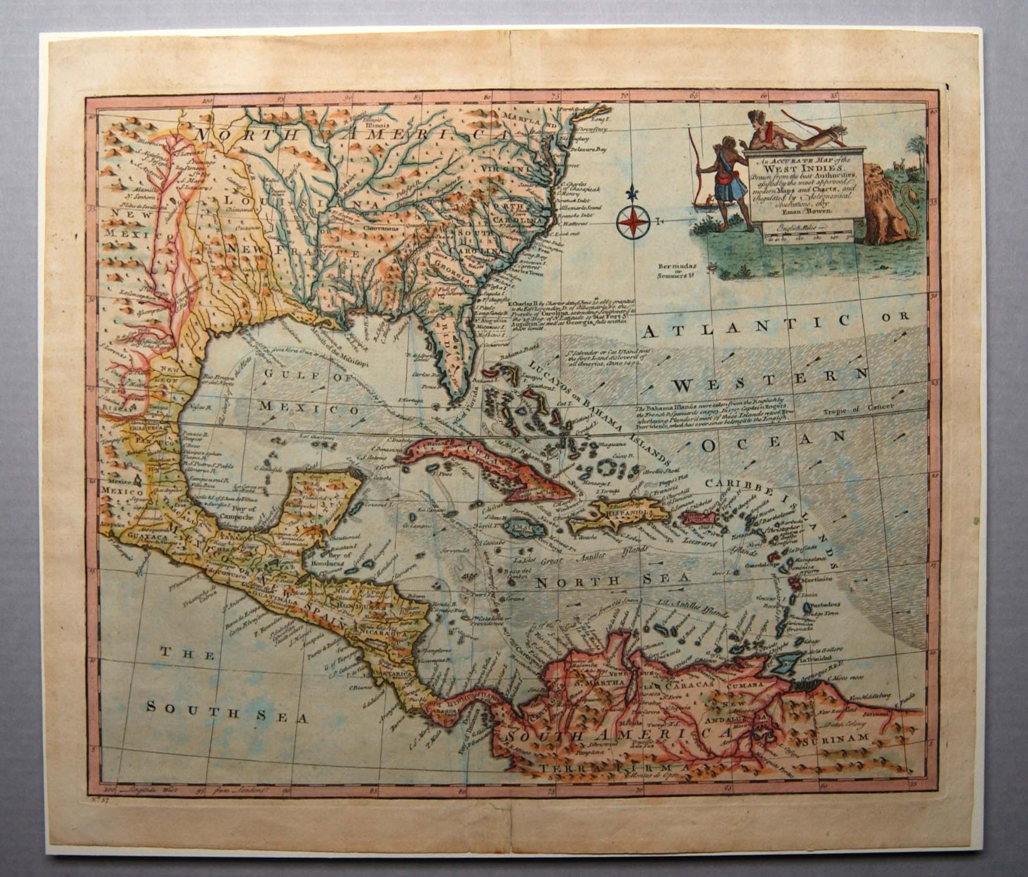 The map shows the West Indies, northern South America, Central America, and North America as far north as Maryland. Around the cartouche are two Carib Indians and the British lion with several unidentified animals in the background. Bowen included three explanatory notes: “K. Charles ii by charter dated June 30h 1665 granted to the E[arl] of Clarendon, D[uke] of Albemarle &c the province of Carolina extending southward to the 20th Deg. of N. Latitude, so that Fort S. Augustine as well as Georgia falls within these limits.” “The Bahama Islands were taken from the English by the French and Spaniards in 1703. In 1717 Capt. Rogers, after having plundered most of these Islands retook New Providence, which has ever since belonged to the English.” “St Salvador or Cat Island was the first Land discovered of all America, Anno 1492.”