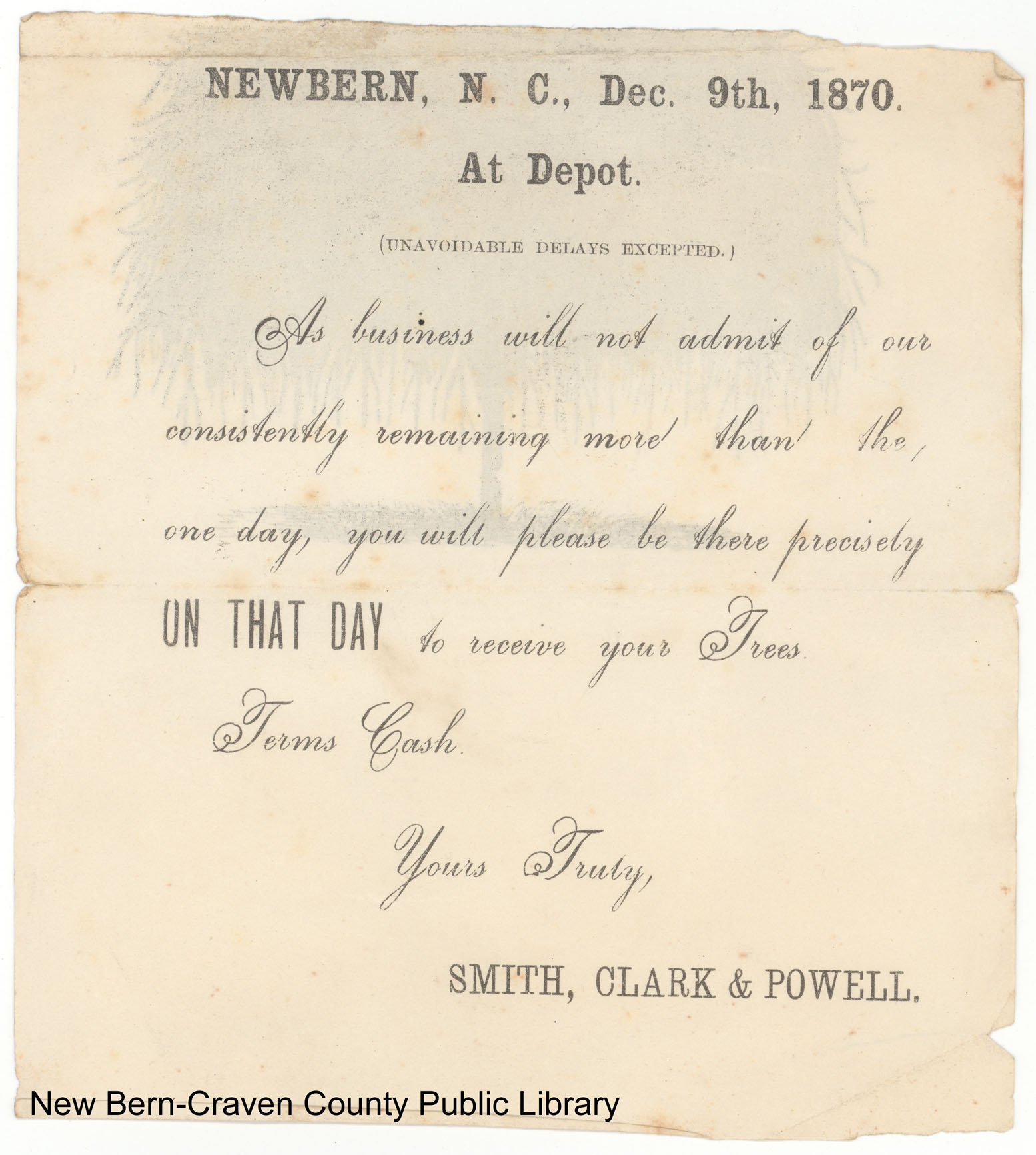 Damaged advertisement (top one-third missing) for trees to be delivered at the New Bern depot on December 9, 1870.