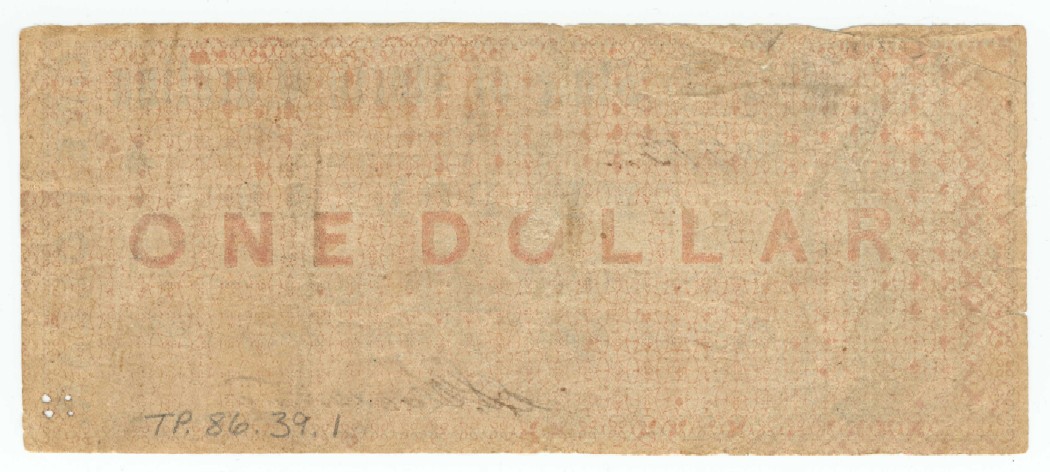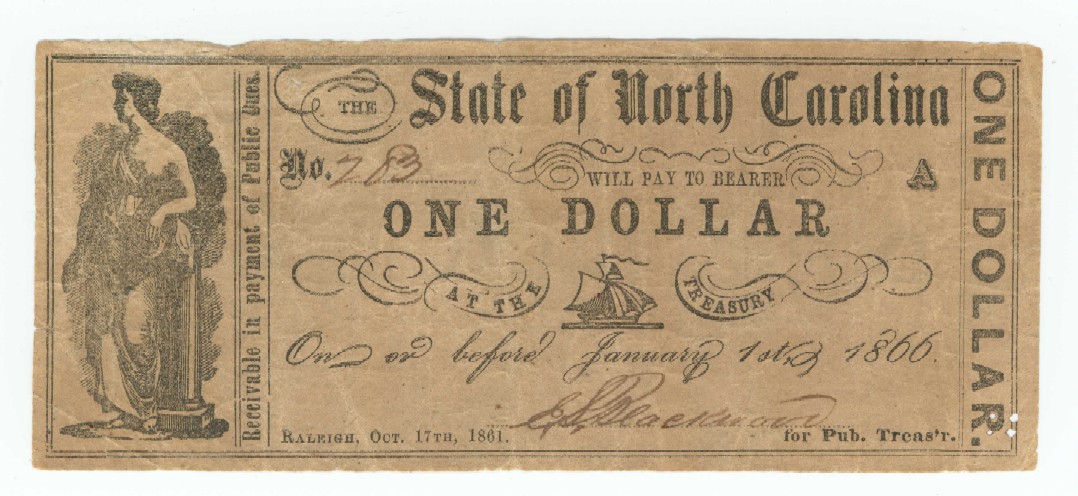 Typeset one-dollar Bill with engraved figure Minerva leaning on a pedestal; narrow border on left inscribed: “Receivable in payment of Public Dues”; narrow border on right: (san serif type) ONE DOLLAR.” Inscription: “the State of North Carolina/ No.283 will pay to bearer/ [Serial letter] A/ ONE DOLLAR/ at the [image of a small sailing ship] treasury/ On or before January 1st 1866./ Raleigh, Oct. 17th, 1861. (signed in ink)”E Blackwood” for Pub. Treasr.” Printed in ornate red on reverse with in red san serif type: “ONE DOLLAR.”