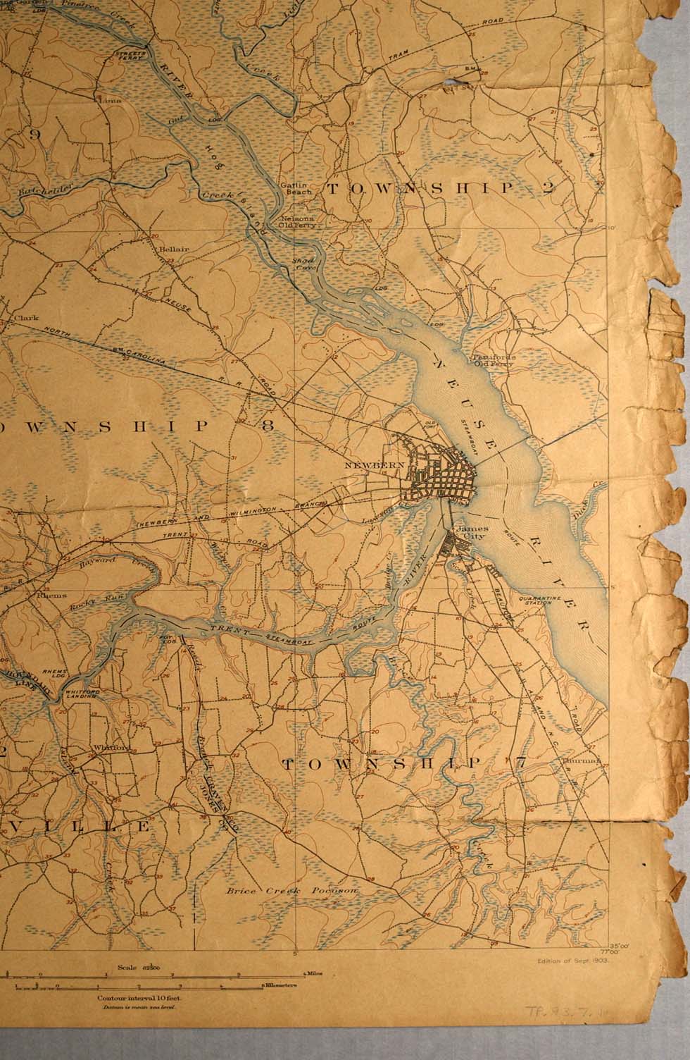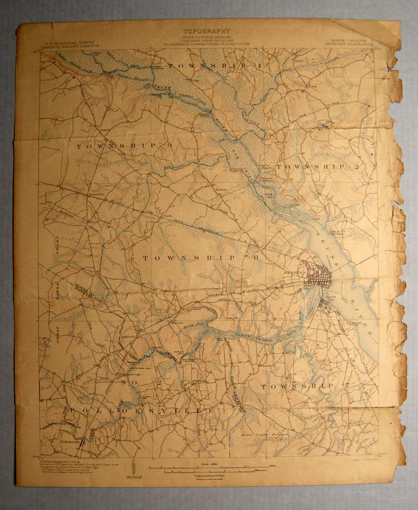Lithograph: Topographical map of “North Carolina New Bern Quadrangle.” Printed above map: US. Geological Survey/ Charles D. Walcott, Director [upper left corner] | J. A. Holmes, State Geologist S. L. Patterson Commissioner of Agriculture. [center] | North Carolina New Bern River Quadrangle [upper right corner] | Engraved June 1903 by U.S.G.S./ H. M. Wilson, Geographer in charge Control by U. S. Coast and Geodetic Survey and Oscar Jones Topography by Albert Pike and T. G. Basinger. Surveyed in 1901 in cooperation with the North Carolina Department of Agriculture. [lower left] | edition of Sept. 1903. [lower right]. | Description of topographic map of the United States; and key to symbols and signs. [on the reverse]