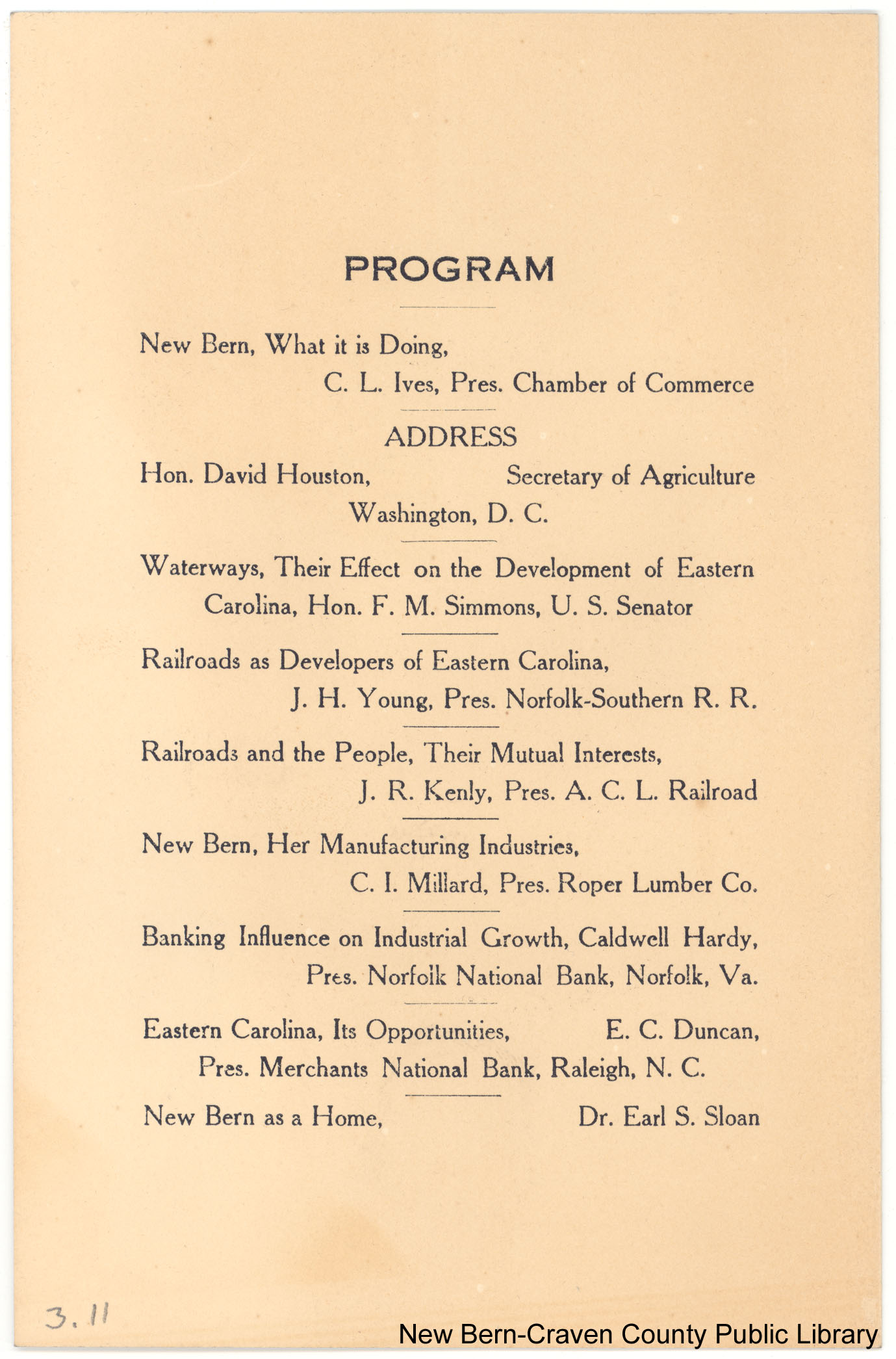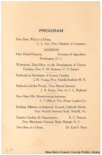 PROGRAM New Bern, What it is Doing. ADDRESS Waterways, Their Effect on the Development of Eastern Carolina Railroads as Developers in Eastern Carolina, Railroads and the People, Their Mutual Interests New Bern, Her Manufacturing Industries Banking Influence on Industrial Growth Eastern Carolina, Its Opportunities New Bern as a Home |