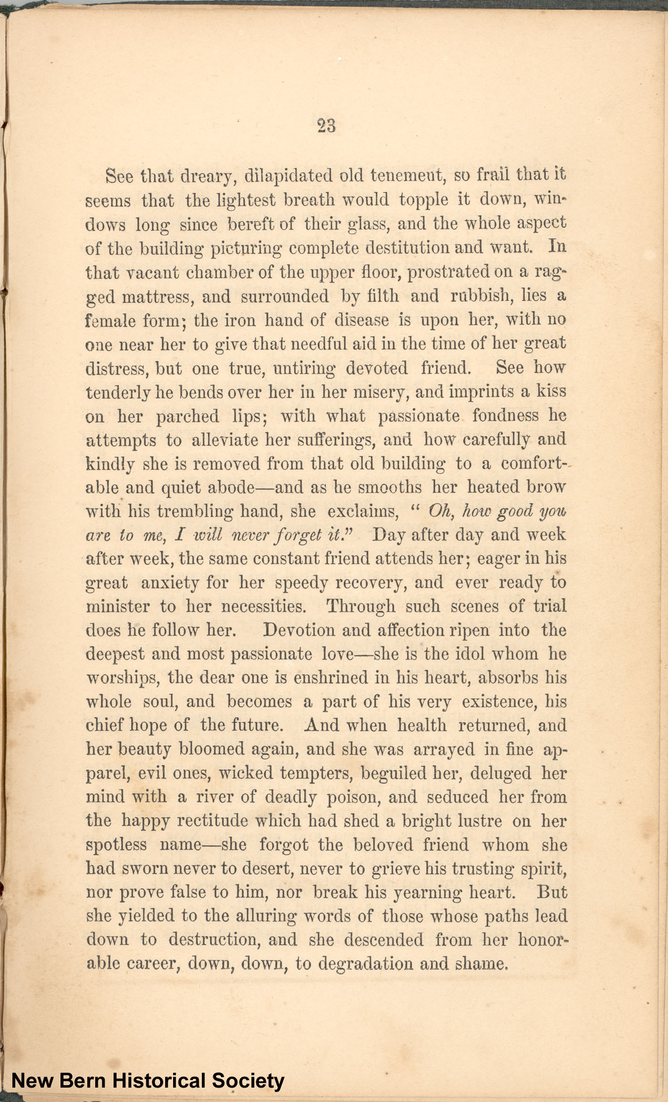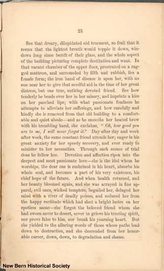 See that dreary, dilapidated old tenement, so frail that it seems that the lightest breath would topple it down, windows long since bereft of their glass, and the whole aspect of the building picturing complete destitution and want. In that vacant chamber of the upper floor, prostrated on a ragged mattress, and surrounded by filth and rubbish, lies a female form; the iron hand of disease is upon her, with no one near her to give that needful aid in the time of her great distress, but one true, untiring devoted friend. See how tenderly he bends over her in her misery, and imprints a kiss on her parched lips; with what passionate fondness he attempts to alleviate her sufferings, and how carefully and kindly she is removed from that old building to a comfortable and quiet abode--and as he smooths her heated brow with his trembling hand, she exclaims, “Oh, how, good you are to me, I will never forget it.” Day after day and week after week, the same constant friend attends her; eager in his great anxiety for her speedy recovery, and ever ready to minister to her necessities. Through such scenes of trial does he follow her. Devotion and affection ripen into the deepest and most passionate love--she is the idol whom he worships, the dear one is enshrined in his heart, absorbs his whole soul, and becomes a part of his very existence, his chief hope of the future. And when health returned, and her beauty bloomed again, and she was arrayed in fine apparel, evil ones, wicked tempters, beguiled her, deluged her mind with a river of deadly poison, and seduced her from the happy rectitude which had shed a bright lustre on her spotless name--she forgot the beloved friend whom she had sworn never to desert, never to grieve his trusting spirit, nor prove false to him, nor break his yearning heart. But she yielded to the alluring words of those whose paths lead down to destruction, and she descended from her honorable career, down, down, to degradation and shame.
