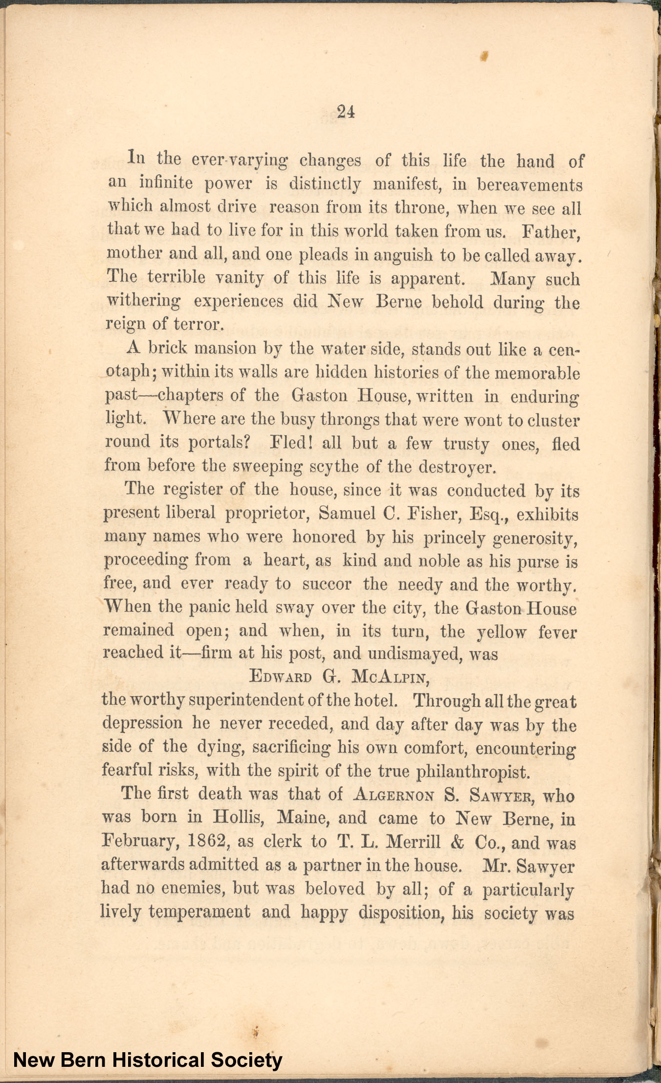 The first death was that of ALGERNON S. SAWYER, who was born in Hollis, Maine, and came to New Berne, in February, 1862, as clerk to T. L. Merrill & Co., and was afterwards admitted as a partner in the house. Mr. Sawyer had no enemies, but was beloved by all; of a particularly lively temperament and happy disposition, his society was