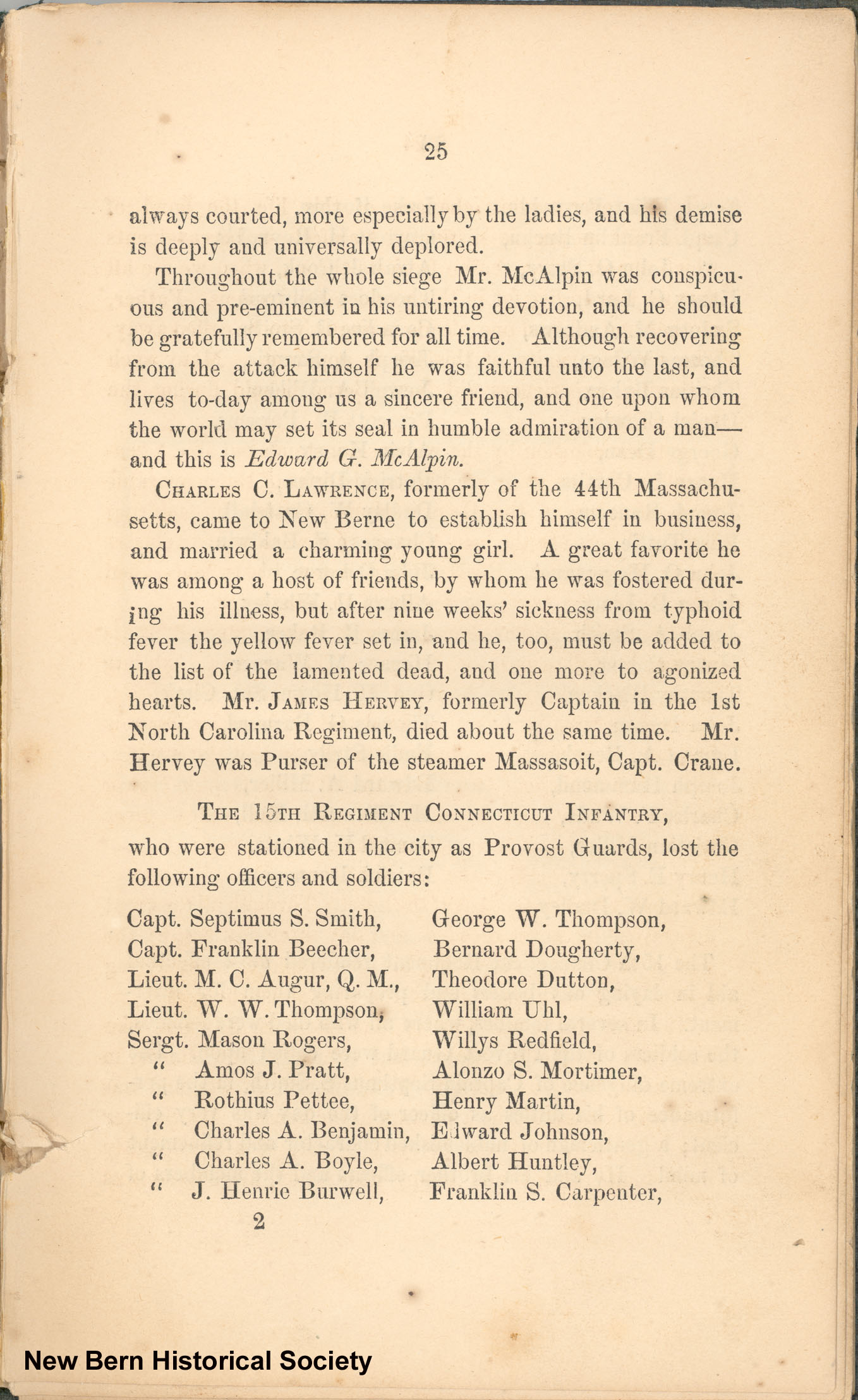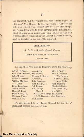 CHARLES C. LAWRENCE, formerly of the 44th Massachusetts, came to New Berne to establish himself in business, and married a charming young girl. A great favorite he was among a host of friends, by whom he was fostered during his illness, but after nine weeks' sickness from typhoid fever the yellow fever set in, and he, too, must be added to the list of the lamented dead, and one more to agonized hearts. Mr. JAMES HERVEY, formerly Captain in the 1st North Carolina Regiment, died about the same time. Mr. Hervey was Purser of the steamer Massasoit, Capt. Crane.