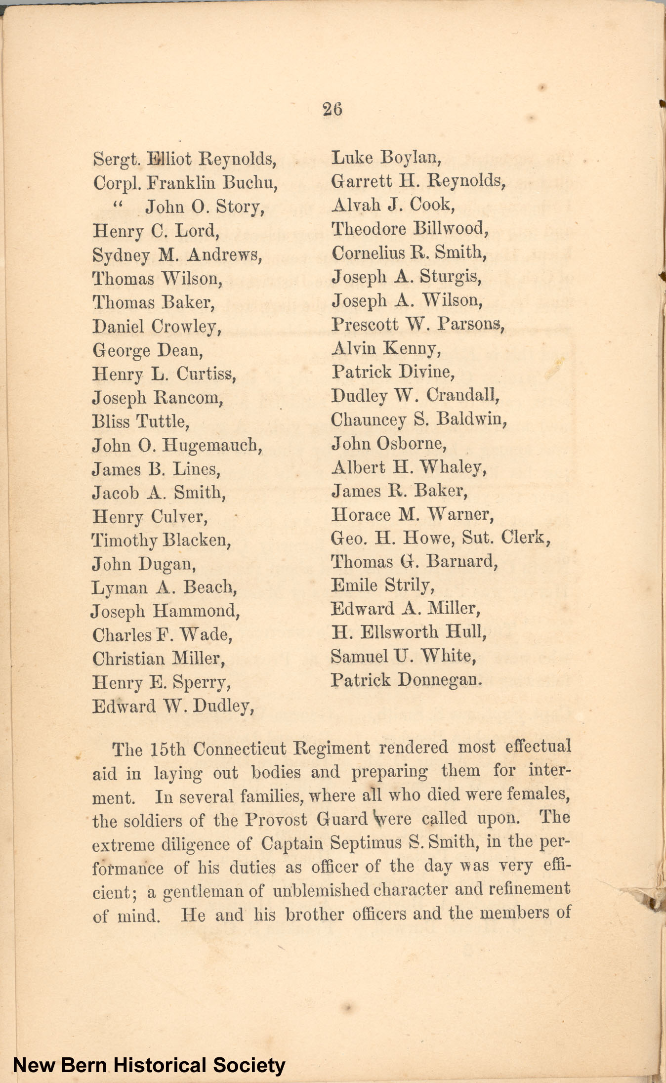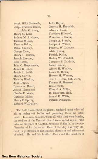 The 15th Connecticut Regiment rendered most effectual aid in laying out bodies and preparing them for interment. In several families, where all who died were females, the soldiers of the Provost Guard were called upon. The extreme diligence of Captain Septimus S. Smith, in the performance of his duties as officer of the day was very efficient; a gentleman of unblemished character and refinement of mind. He and his brother officers and the members of
