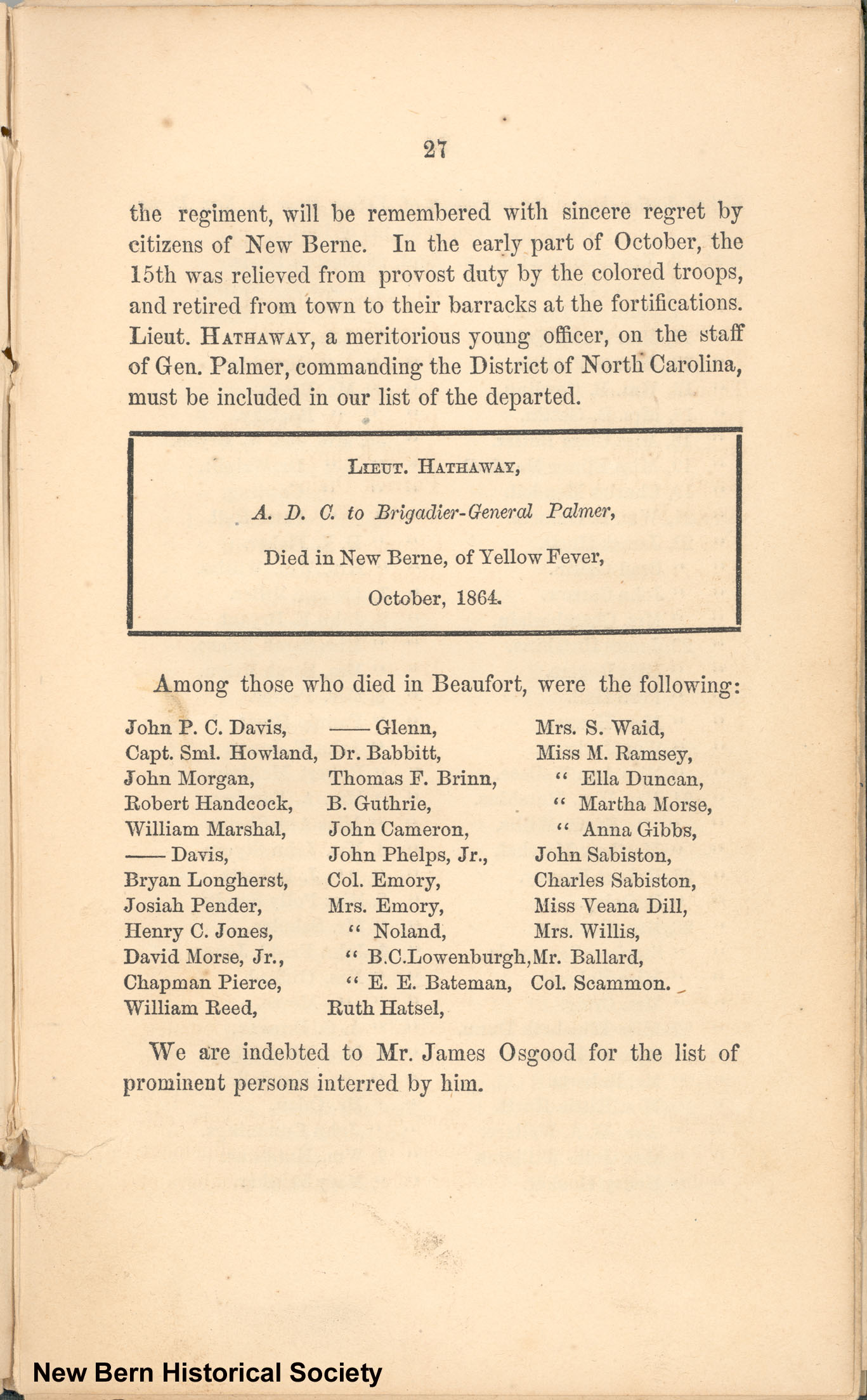 the regiment, will be remembered with sincere regret by citizens of New Berne. In the early part of October, the 15th was relieved from provost duty by the colored troops, and retired from town to their barracks at the fortifications. Lieut. HATHAWAY, a meritorious young officer, on the staff of Gen. Palmer, commanding the District of North Carolina, must be included in our list of the departed.