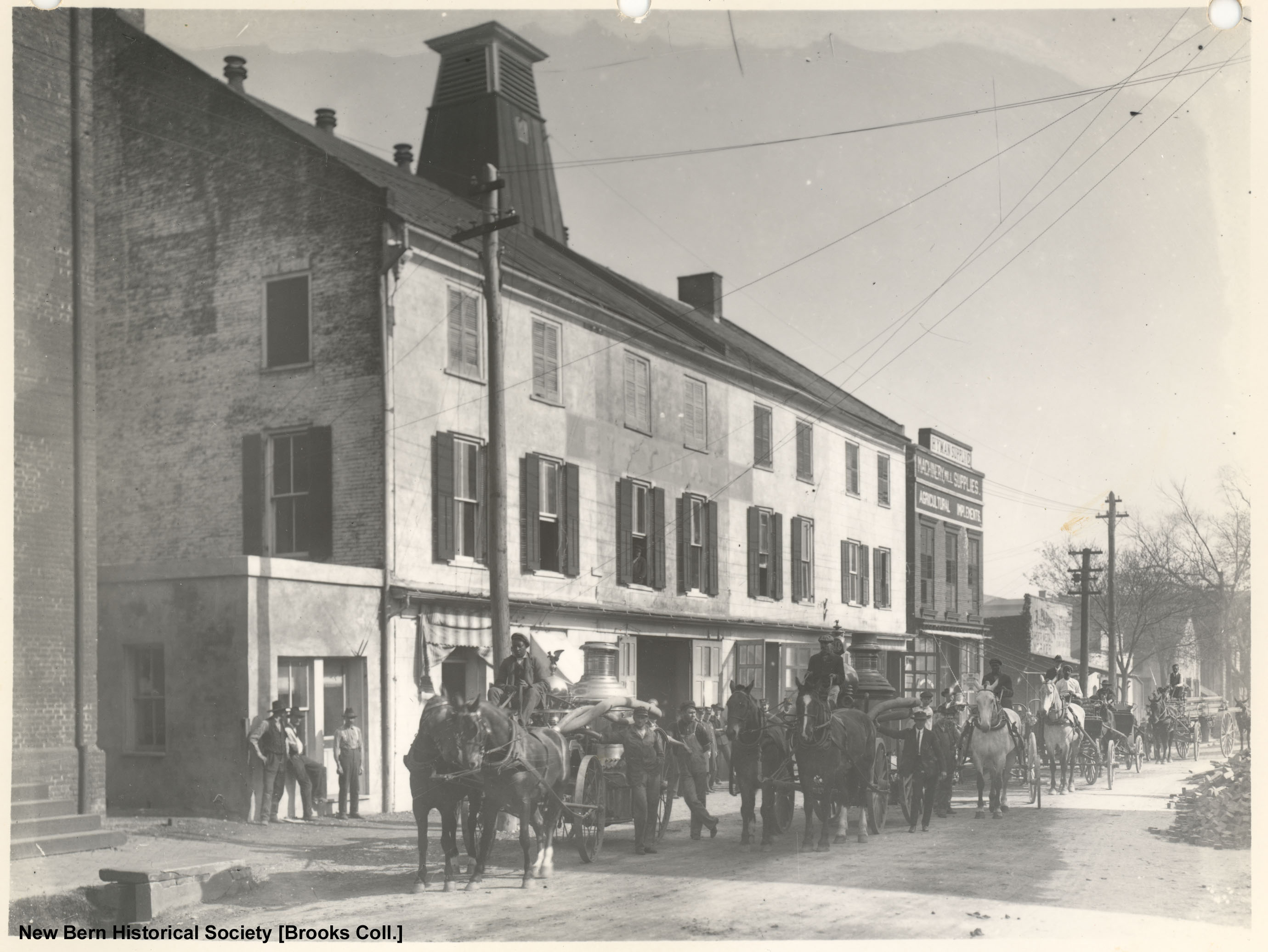 Title: Fire Department parade showing steam engines and hose wagons, 200 block Craven Street, east side, ca. 1900