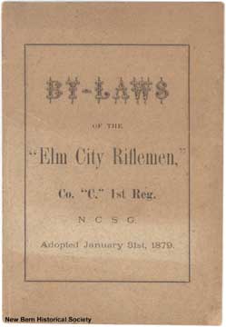 Description: Booklet describing the bylaws and order of business for the Elm City Riflemen, a militia unit based in New Bern, N.C. Also included are a list of the officers for 1879.