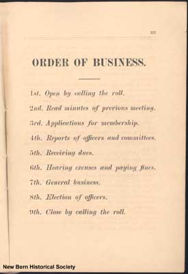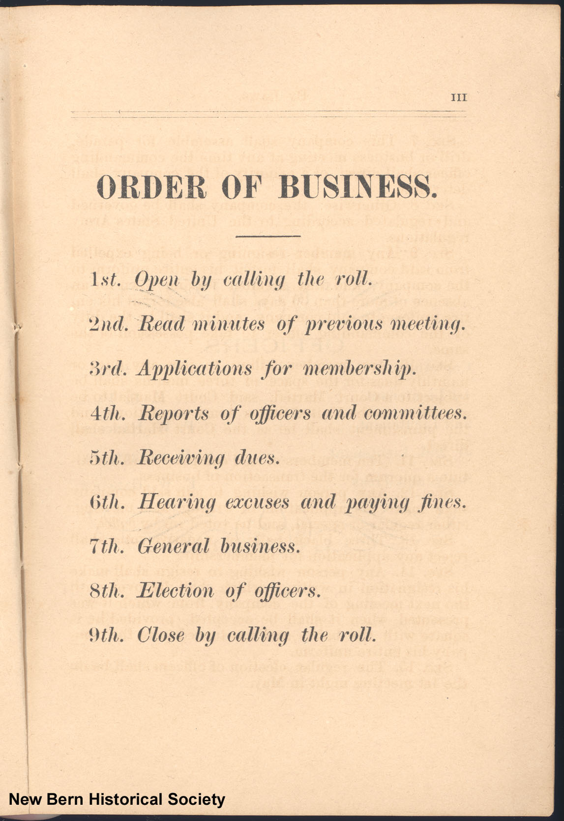 III ORDER OF BUSINESS. 1st. Open by calling the roll. 2nd. Read minutes of previous meeting. 3rd. Applications for membership. 4th. Reports of officers and committees. 5th. Receiving dues. 6th. Hearing excuses and paying fines. 7th. General business. 8th. Election of officers. 9th. Close by calling the roll. |