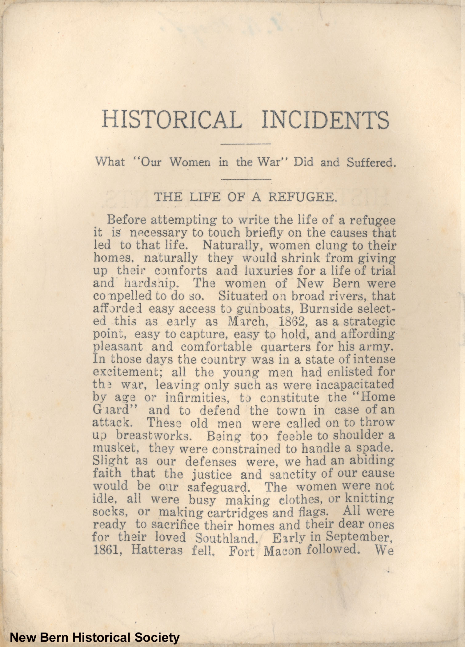 [p. 2] HISTORICAL INCIDENTS What "Our Women in the War" Did and Suffered. THE LIFE OF A REFUGEE. Before attempting to write the life of a refugee it is necessary to touch briefly on the causes that led to that life. Naturally, women clung to their homes, naturally they would shrink from giving up their comforts and luxuries for a life of trial and hardship. The women of New Bern were compelled to do so. Situated on broad rivers, that afforded easy access to gunboats, Burnside selected this as early as March, 1862, as a strategic point, easy to capture, easy to hold, and affording pleasant and comfortable quarters for his army. In those days the country was in a state of intense excitement; all the young men had enlisted for the war, leaving only such as were incapacitated by age or infirmities, to constitute the "Home Guard" and to defend the town in case of an attack. These old men were called on to throw up breastworks. Being too feeble to shoulder a musket, they were constrained to handle a spade. Slight as our defenses were, we had an abiding faith that the justice and sanctity of our cause would be our safeguard. The women were not idle, all were busy making clothes, or knitting socks, or making cartridges and flags. All were ready to sacrifice their homes and their dear ones for their loved Southland. Early in September, 1861, Hatteras fell. Fort Macon followed. We