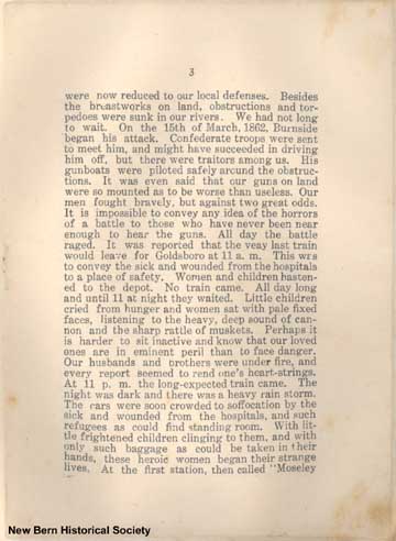 3 were now reduced to our local defenses. Besides the breastworks on land, obstructions and torpedoes were sunk in our rivers. We had not long to wait. On the 15th of March, 1862, Burnside began his attack. Confederate troops were sent to meet him, and might have succeeded in driving him off, but there were traitors among us. His gunboats were piloted safely around the obstructions. It was even said that our guns on land were so mounted as to be worse than useless. Our men fought bravely, but against two great odds. It is impossible to convey any idea of the horrors of a battle to those who have never been near enough to hear the guns. All day the battle raged. It was reported that the veay last train would leave for Goldsboro at 11 a.m. This was to convey the sick and wounded from the hospitals to a place of safety. Women and children hastened to the depot. No train came. All day long and until 11 at night they waited. Little children cried from hunger and women sat with pale fixed faces, listening to the heavy, deep sound of cannon and the sharp rattle of muskets. Perhaps it is harder to sit inactive and know that our loved ones are in eminent peril than to face danger. Our husbands and brothers were under fire, and every report seemed to rend one's heart-strings. At 11 p.m. the long-expected train came. The night was dark and there was a heavy rain storm. The cars were soon crowded to soffocation by the sick and wounded from the hospitals, and such refugees as could find standing room. With little frightened children clinging to them, and with only such baggage as could be taken in their hands, these heroic women began their strange lives. At the first station, then called “Moseley