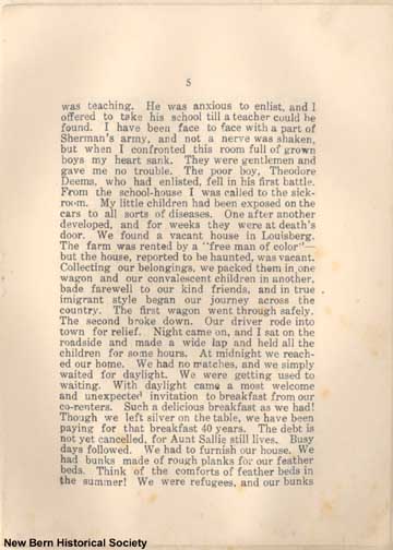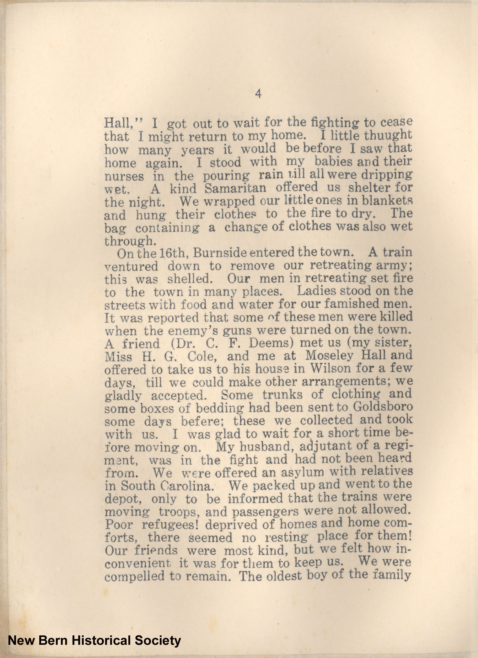 4 Hall,” I got out to wait for the fighting to cease that I might return to my home. I little thuught how many years it would be before I saw that home again. I stood with my babies and their nurses in the pouring rain till all were dripping wet. A kind Samaritan offered us shelter for the night. We wrapped our little ones in blankets and hung their clothes to the fire to dry. The bag containing a change of clothes was also wet through. On the 16th, Burnside entered the town. A train ventured down to remove our retreating army; this was shelled. Our men in retreating set fire to the town in many places. Ladies stood on the streets with food and water for our famished men. It was reported that some of these men were killed when the enemy's guns were turned on the town. A friend (Dr. C.F. Deems) met us (my sister, Miss H.G. Cole, and me at Moseley Hall and offered to take us to his house in Wilson for a few days, till we could make other arrangements; we gladly accepted. Some trunks of clothing and some boxes of bedding had been sent to Goldsboro some days befere; these we collected and took with us. I was glad to wait for a short time before moving on. My husband, adjutant of a regiment, was in the fight and had not been heard from. We were offered an asylum with relatives in South Carolina. We packed up and went to the depot, only to be informed that the trains were moving troops, and passengers were not allowed. Poor refugees! deprived of homes and home comforts, there seemed no resting place for them! Our friends were most kind, but we felt how inconvenient it was for them to keep us. We were compelled to remain. The oldest boy of the family |