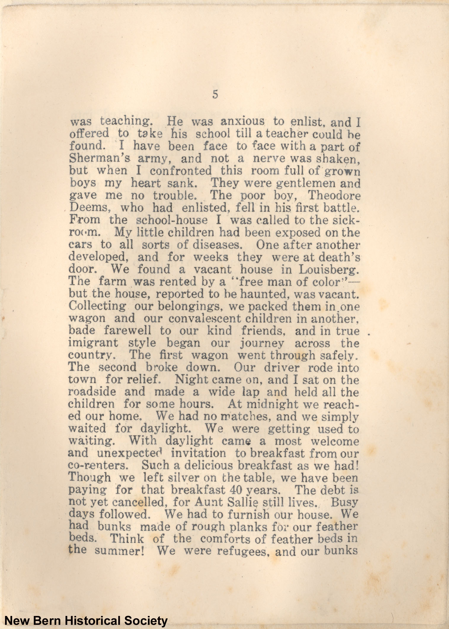 5 was teaching. He was anxious to enlist, and I offered to take his school till a teacher could he found. I have been face to face with a part of Sherman's army, and not a nerve was shaken, but when I confronted this room full of grown boys my heart sank. They were gentlemen and gave me no trouble. The poor boy, Theodore Deems, who had enlisted, fell in his first battle. From the school-house I was called to the sickroom. My little children had been exposed on the cars to all sorts of diseases. One after another developed, and for weeks they were at death's door. We found a vacant house in Louisberg. The farm was rented by a "free man of color"--but the house, reported to he haunted, was vacant. Collecting our belongings, we packed them in one wagon and our convalescent children in another, bade farewell to our kind friends, and in true imigrant style began our journey across the country. The first wagon went through safely. The second broke down. Our driver rode into town for relief. Night came on, and I sat on the roadside and made a wide lap and held all the children for some hours. At midnight we reached our home. We had no matches, and we simply waited for daylight. We were getting used to waiting. With daylight came a most welcome and unexpected invitation to breakfast from our co-renters. Such a delicious breakfast as we had! Though we left silver on the table, we have been paying for that breakfast 40 years. The debt is not yet cancelled, for Aunt Sallie still lives. Busy days followed. We had to furnish our house. We had bunks made of rough planks for our feather beds. Think of the comforts of feather beds in the summer! We were refugees, and our bunks