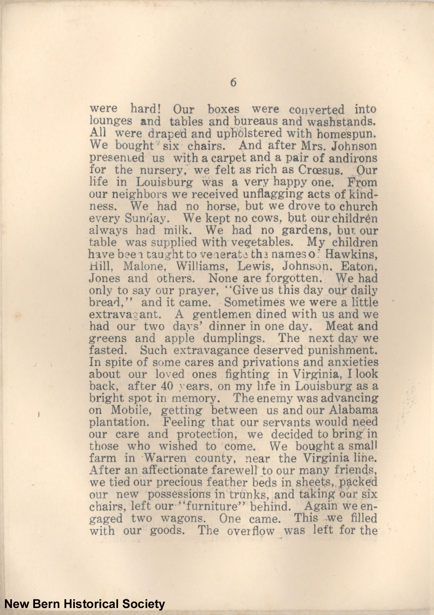 6 were hard! Our boxes were converted into lounges and tables and bureaus and washstands. All were draped and upholstered with homespun. We bought six chairs. And after Mrs. Johnson presented us with a carpet and a pair of andirons for the nursery, we felt as rich as Croesus. Our life in Louisburg was a very happy one. From our neighbors we received unflagging acts of kindness. We had no horse, but we drove to church every Sunday. We kept no cows, but our children always had milk. We had no gardens, but, our table was supplied with vegetables. My children have been taught to venerate the names of Hawkins, Hill, Malone, Williams, Lewis, Johnson, Eaton, Jones and others. None are forgotten. We had only to say our prayer, “Give us this day our daily bread,” and it came. Sometimes we were a little extravagant. A gentlemen dined with us and we had our two days’ dinner in one day. Meat and greens and apple dumplings. The next day we fasted. Such extravagance deserved punishment. In spite of some cares and privations and anxieties about our loved ones fighting in Virginia, I look back, after 40 years, on my life in Louisburg as a bright spot in memory. The enemy was advancing on Mobile, getting between us and our Alabama plantation. Feeling that our servants would need our care and protection, we decided to bring in those who wished to come. We bought a small farm in Warren county, near the Virginia line. After an affectionate farewell to our many friends, we tied our precious feather beds in sheets, packed our new possessions in trunks, and taking our six chairs, left our “furniture” behind. Again we engaged two wagons. One came. This we filled with our goods. The overflow was left for the