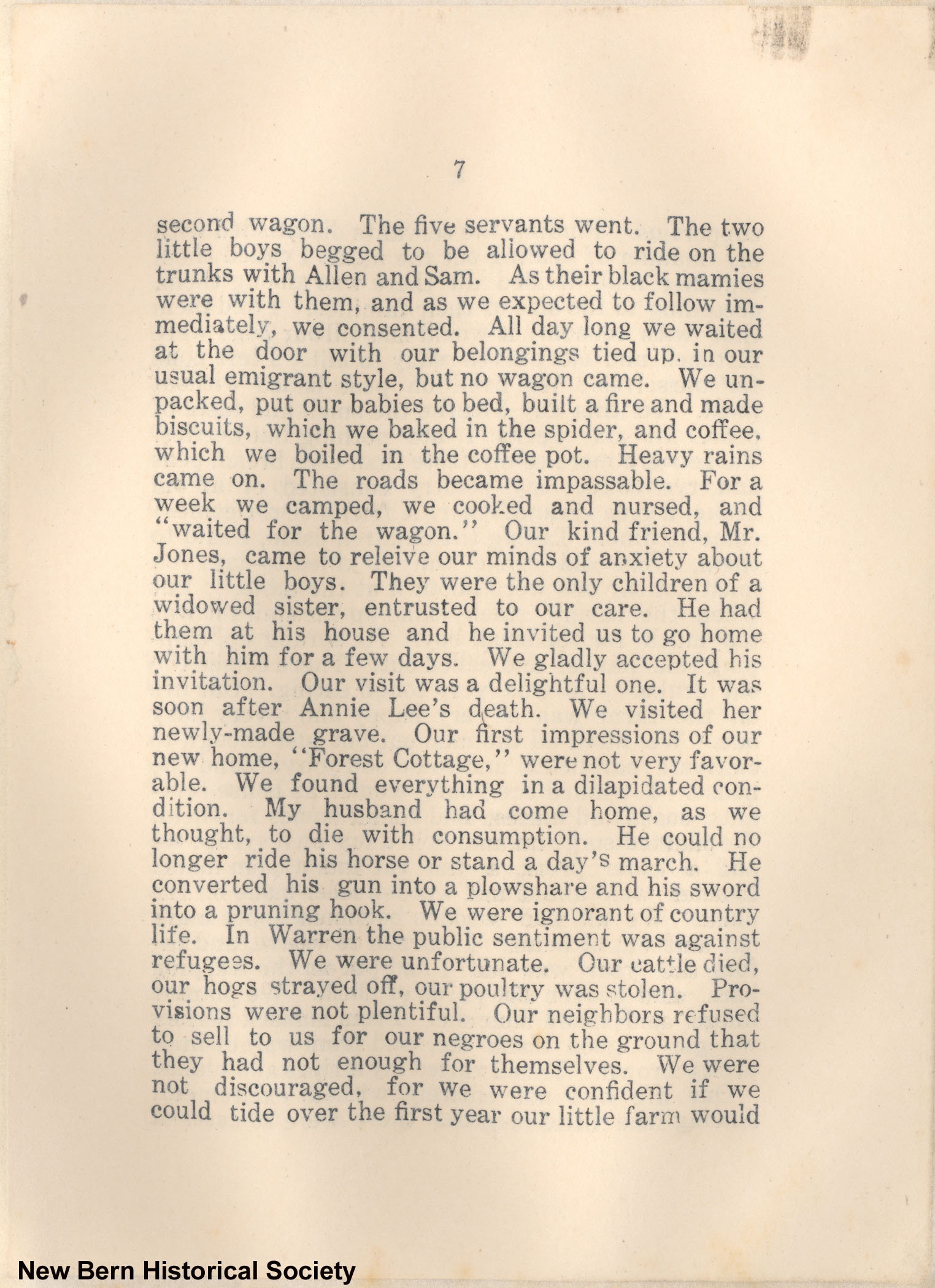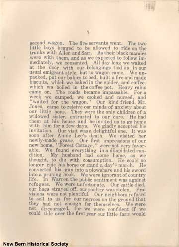 7 second wagon. The five servants went. The two little boys begged to be allowed to ride on the trunks with Allen and Sam. As their black marries were with them, and as we expected to follow immediately, we consented. All day long we waited at the door with our belongings tied up in our usual emigrant style, but no wagon came. We unpacked, put our babies to bed, built a fire and made biscuits, which we baked in the spider, and coffee, which we boiled in the coffee pot. Heavy rains came on. The roads became impassable. For a week we camped, we cooked and nursed, and “waited for the wagon.” Our kind friend, Mr. Jones, came to releive our minds of anxiety about our little boys. They were the only children of a widowed sister, entrusted to our care. He had them at his house and he invited us to go home with him for a few days. We gladly accepted his invitation. Our visit was a delightful one. It was soon after Annie Lee’s death. We visited her newly-made grave. Our first impressions of our new home, “Forest Cottage,” were not very favorable. We found everything in a dilapidated condition. My husband had come home, as we thought, to die with consumption. He could no longer ride his horse or stand a day’s march. He converted his gun into a plowshare and his sword into a pruning hook. We were ignorant of country life. In Warren the public sentiment was against refugees. We were unfortunate. Our cattle died, our hogs strayed off, our poultry was stolen. Provisions were not plentiful. Our neighbors refused to sell to us for our negroes on the ground that they had not enough for themselves. We were not discouraged, for we were confident if we could tide over the first year our little farm would