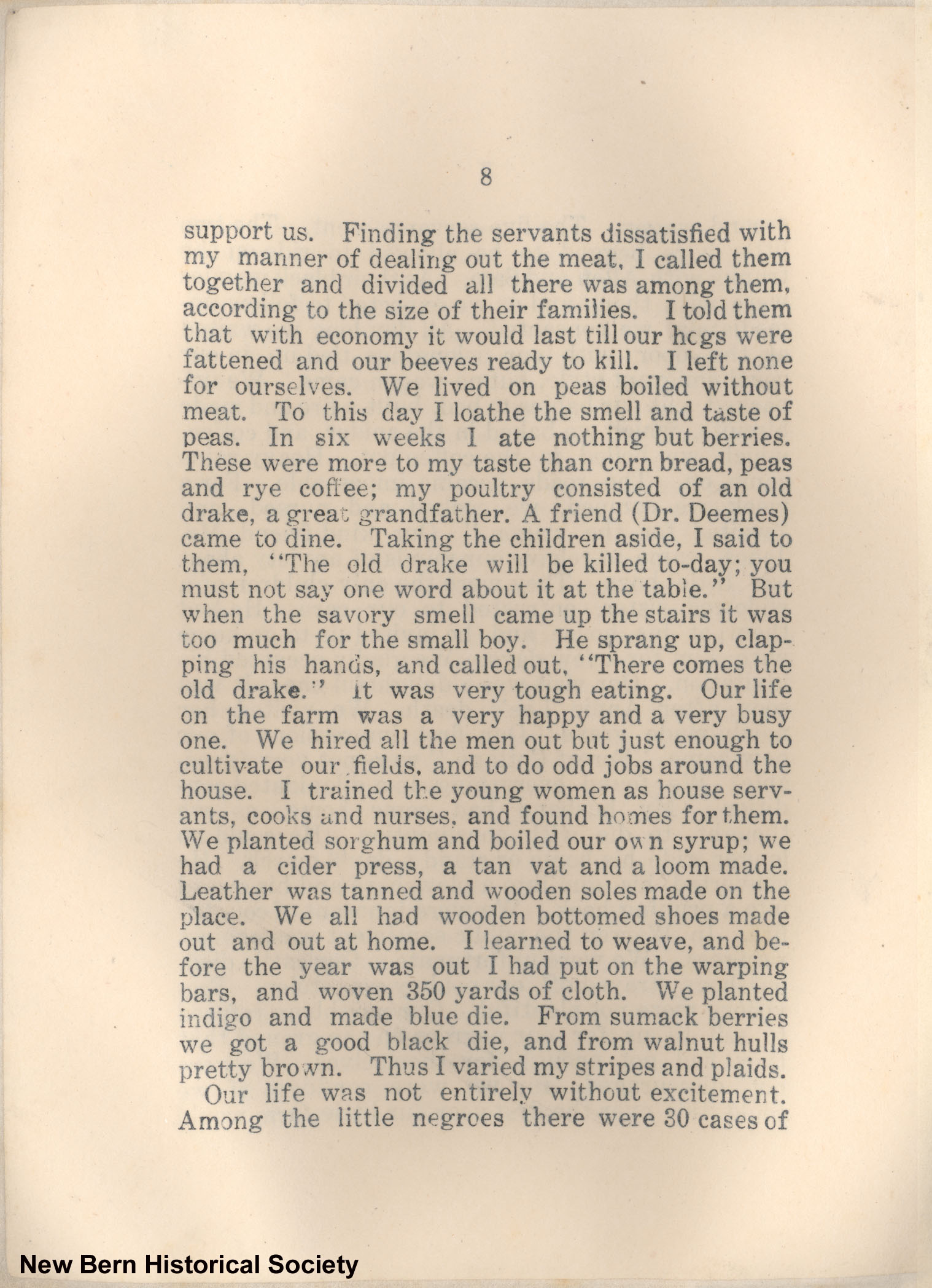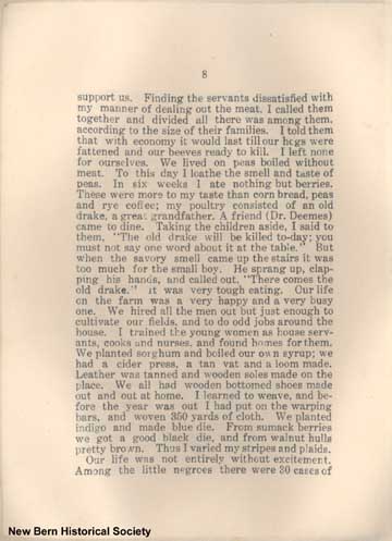 8 support us. Finding the servants dissatisfied with my manner of dealing out the meat, I called them together and divided all there was among them. according to the size of their families. I told them that with economy it would last till our hogs were fattened and our beeves ready to kill. I left none for ourselves. We lived on peas boiled without meat. To this day I loathe the smell and taste of peas. In six weeks I ate nothing but berries. These were more to my taste than corn bread, peas and rye coffee my poultry consisted of an old drake, a great grandfather. A friend (Dr. Deemes) came to dine. Taking the children aside, I said to them, “The old drake will be killed to-day; you must not say one word about it at the table.” But when the savory smell came up the stairs it was too much for the small boy. He sprang up, clapping his hands, and called out, “There comes the old drake.” It was very tough eating. Our life on the farm was a very happy and a very busy one. We hired all the men out but just enough to cultivate our fields, and to do odd jobs around the house. I trained the young women as house servants, cooks and nurses. and found homes for them. We planted sorghum and boiled our own syrup; we had a cider press, a tan vat and a loom made. Leather was tanned and wooden soles made on the place. We all had wooden bottomed shoes made out and out at home. I learned to weave, and before the year was out I had put on the warping bars, and woven 350 yards of cloth. We planted indigo and made blue die. From sumack berries we got a good black die, and from walnut hulls pretty brown. Thus I varied my stripes and plaids. Our life was not entirely without excitement. Among the little negroes there were 30 cases of