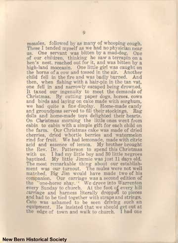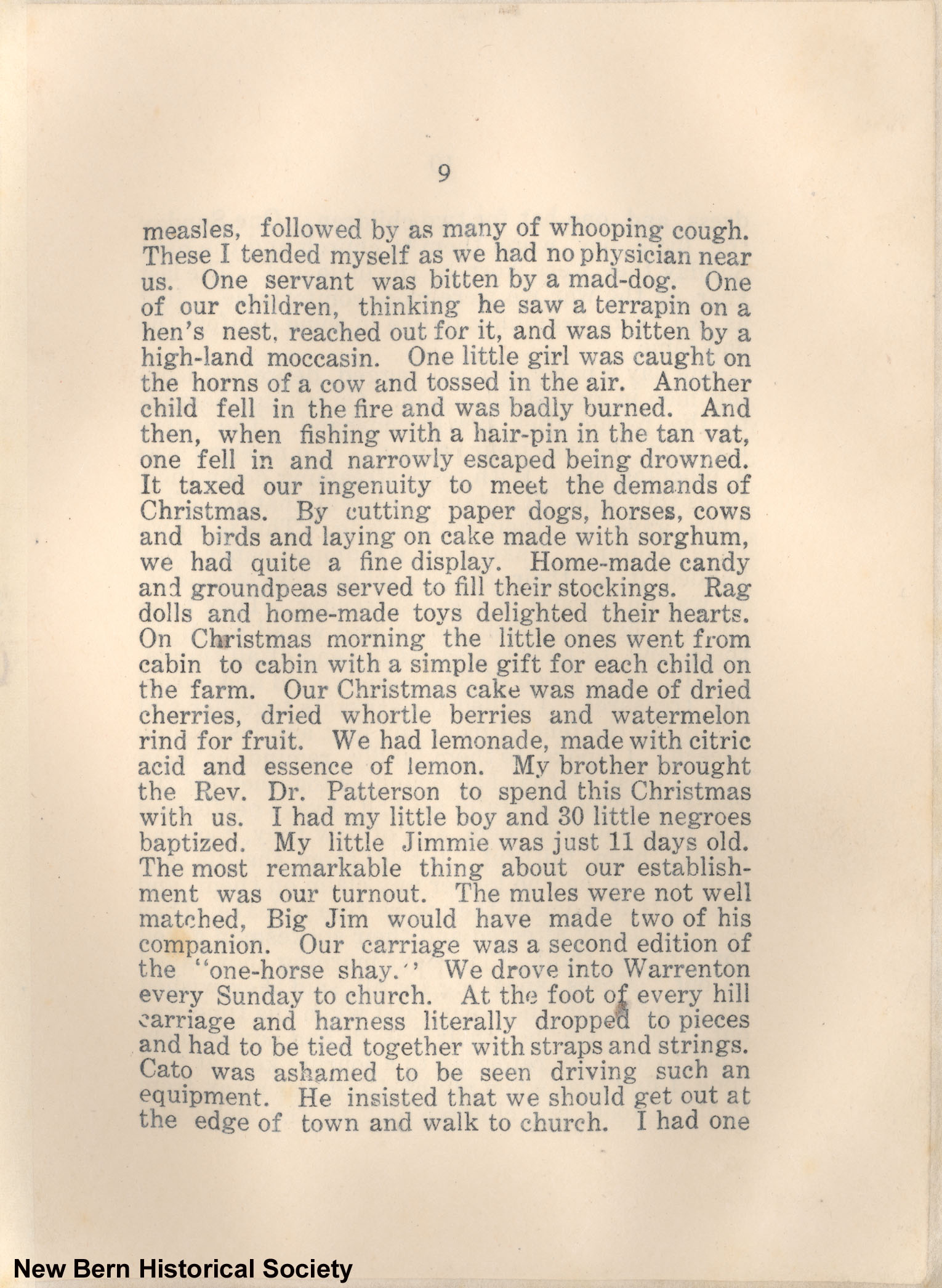 9 measles, followed by as many of whooping cough. These I tended myself as we had no physician near us. One servant was bitten by a mad-dog. One of our children, thinking he saw a terrapin on a hen's nest, reached out for it, and was bitten by a high-land moccasin. One little girl was caught on the horns of a cow and tossed in the air. Another child fell in the fire and was badly burned. And then, when fishing with a hair-pin in the tan vat, one fell in and narrowly escaped being drowned. It taxed our ingenuity to meet the demands of Christmas. By cutting paper dogs, horses, cows and birds and laying on cake made with sorghum, we had quite a fine display. Home-made candy and groundpeas served to fill their stockings. Rag dolls and home-made toys delighted their hearts. On Christmas morning the little ones went from cabin to cabin with a simple gift for each child on the farm. Our Christmas cake was made of dried cherries, dried whortle berries and watermelon rind for fruit. We had lemonade, made with citric acid and essence of lemon. My brother brought the Rev. Dr. Patterson to spend this Christmas with us. I had my little boy and 30 little negroes baptized. My little Jimmie was just 11 days old. The most remarkable thing about our establishment was our turnout. The mules were not well matched, Big Jim would have made two of his companion. Our carriage was a second edition of the “one-horse shay.” We drove into Warrenton every Sunday to church. At the foot of every hill carriage and harness literally dropped to pieces and had to be tied together with straps and strings. Cato was ashamed to be seen driving such an equipment. He insisted that we should get out at the edge of town and walk to church. I had one