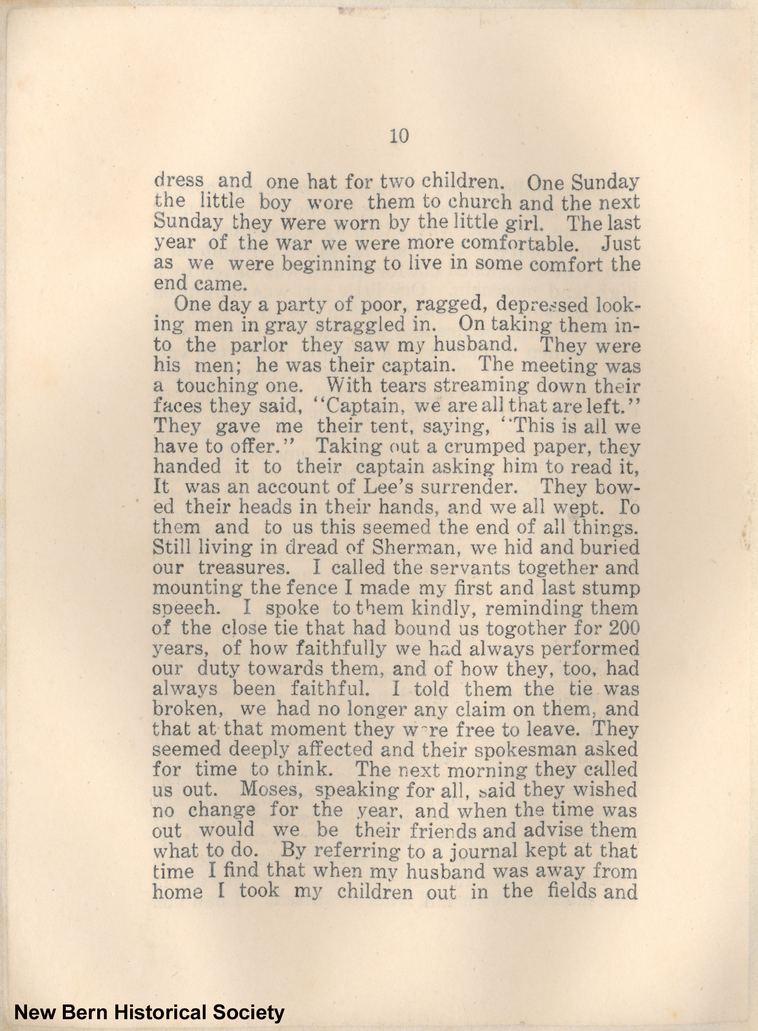 10 dress and one hat for two children. One Sunday the little boy wore them to church and the next Sunday they were worn by the little girl. The last year of the war we were more comfortable. Just as we were beginning to live in some comfort the end came. One day a party of poor, ragged, depressed looking men in gray straggled in. On taking them into the parlor they saw my husband. They were his men; he was their captain. The meeting was a touching one. With tears streaming down their faces they said, “Captain, we are all that are left.” They gave me their tent, saying, “This is all we have to offer.” Taking out a trumped paper, they handed it to their captain asking him to read it, It was an account of Lee’s surrender. They bowed their heads in their hands, and we all wept. To them and to us this seemed the end of all things. Still living in dread of Sherman, we hid and buried our treasures. I called the servants together and mounting the fence I made my first and last stump speech. I spoke to them kindly, reminding them of the close tie that had bound us togother for 200 years, of how faithfully we had always performed our duty towards them, and of how they, too, had always been faithful. I told them the tie was broken, we had no longer any claim on them, and that at that moment they were free to leave. They seemed deeply affected and their spokesman asked for time to think. The next morning they called us out. Moses, speaking for all, said they wished no change for the year, and when the time was out would we be their friends and advise them what to do. By referring to a journal kept at that time I find that when my husband was away from home I took my children out in the fields and
