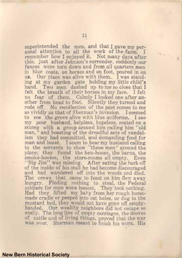 11 superintended the men, and that I gave my personal attention to all the work of the farm. I remember how I enjoyed it. Not many days after this, just after Johnson's surrender, suddenly our fences were torn down and from all quarters men in blue coats, on horses and on foot, poured in on us. Our place was alive with them. I was standing at my garden gate holding my little child's hand. Two men dashed up to me so close that I felt the breath of their horses in my face. I felt no fear of them. Calmly I looked one after another from head to foot. Silently they turned and rode off. No recollection of the past comes to me so vividly as that of Sherman's invasion. I seemed to see the grove alive with blue uniforms. I see my poor husband, helpless, hopeless, seated on a stump with a group around him calling him "old man," and boasting of the dreadful acts of vandalism they had committed, and demanding food for man and beast. I seem to hear my husband calling to the servants to show "these men" around the place; they found the hen-house, the barns, the smoke-houses, the store-rooms all empty. Even "Big Jim" was missing. After eating the bark off of the inside of his stall he had become discouraged and had wandered off into the woods and died. The crows that came to feast on him flew away hungry. Finding nothing to steal, the Federal soldiers for once were honest. They took nothing. Had they lifted my baby from her rough homemade cradle or peeped into rat holes, or dug in the mustard bed, they would not have gone off empty-handed. Our wealthy neighbors did not escape so easily. The long line of empty carriages, the droves of cattle and of living things, proved that the war was over. Sherman meant to finish his work. His