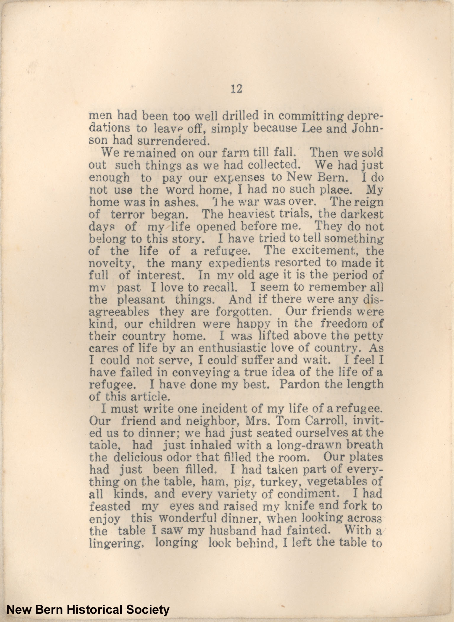 12 men had been too well drilled in committing depredations to leave off, simply because Lee and Johnson had surrendered. We remained on our farm till fall. Then we sold out such things as we had collected. We had just enough to pay our expenses to New Bern. I do not use the word home, I had no such place. My home was in ashes. The war was over. The reign of terror began. The heaviest trials, the darkest days of my life opened before me. They do not belong to this story. I have tried to tell something of the life of a refugee. The excitement, the novelty, the many expedients resorted to made it full of interest. In my old age it is the period of my past I love to recall. I seem to remember all the pleasant things. And if there were any disagreeables they are forgotten. Our friends were kind, our children were happy in the freedom of their country home. I was lifted above the petty cares of life by an enthusiastic love of country. As I could not serve, I could suffer and wait. I feel I have failed in conveying a true idea of the life of a refugee. I have done my best. Pardon the length of this article. I must write one incident of my life of a refugee. Our friend and neighbor, Mrs. Tom Carroll, invited us to dinner; we had just seated ourselves at the table, had just inhaled with a long-drawn breath the delicious odor that filled the room. Our plates had just been filled. I had taken part of everything on the table, ham, pig, turkey, vegetables of all kinds, and every variety of condiment. I had feasted my eyes and raised my knife and fork to enjoy this wonderful dinner, when looking across the table I saw my husband had fainted. With a lingering, longing look behind, I left the table to