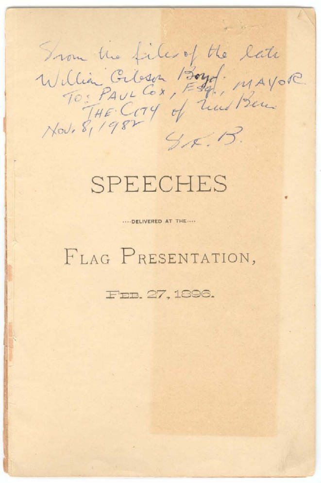 transcription of the speeches delivered in 1896 upon the presentation of a Flag