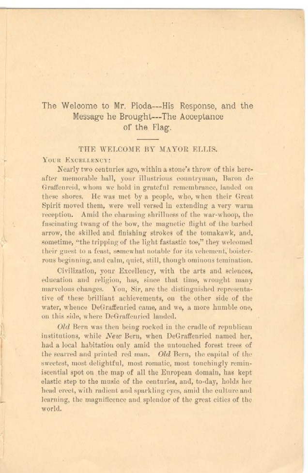 Standing here, as I do, Sir, the Mayor of the City, the accredited representative of New Bern, her old men and her young men, her old women and her young women, her boys and her girls —I extend to you a welcome very unlike the welcome of the olden time—from her heart of hearts. Your distinguished and benignant presence has captured the city. It is yours, Sir, take it. It belongs to you, of rights. This day, the daughter is locked in the fond embrace of the mother. New Bern is the willing captive of Old Bern, and with glad acclaim, she shouts Welcome! Welcome! thrice Welcome! to you, Your Excellency, and the unique occasion that brings the two Berns together, after such a long and anxious separation.
