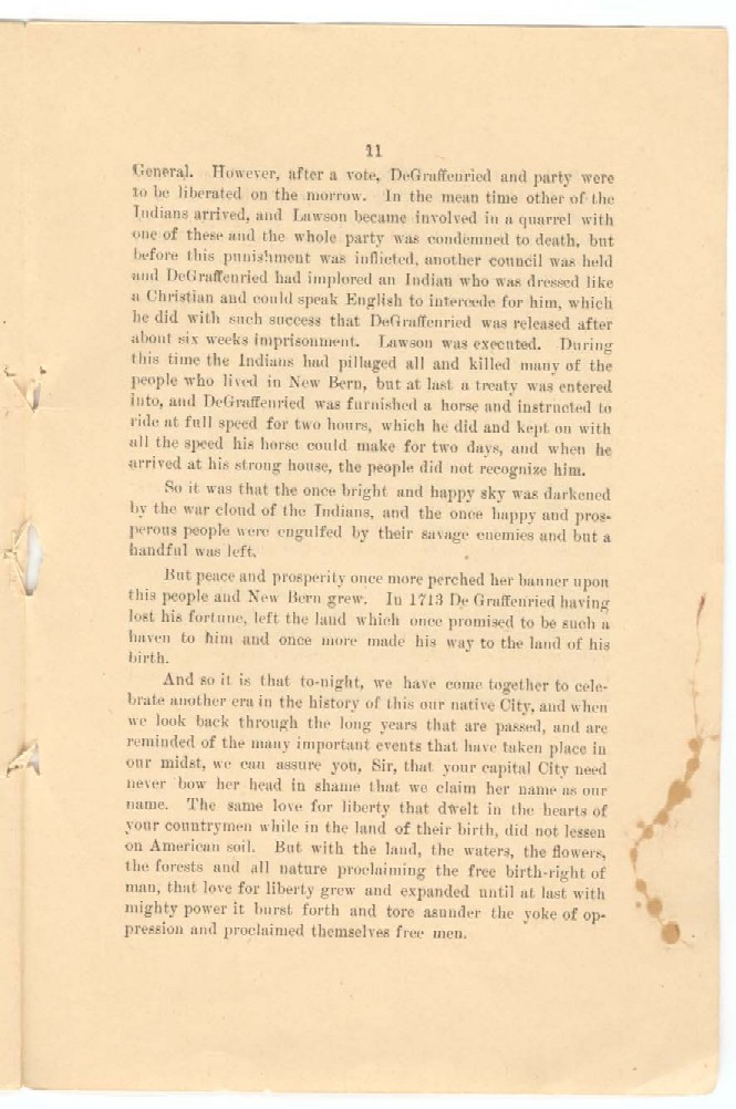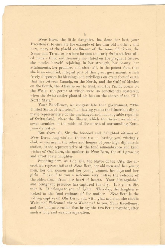 But above all, Sir, the honored and delighted citizens of New Bern, congratulate themselves on having you, “fittingly clad, as you are in the robes and honors of your high diplomatic station, as the representative of the fond remembrance and kind wishes of Old Bern, the mother, to New Bern, the still growing and affectionate daughter.