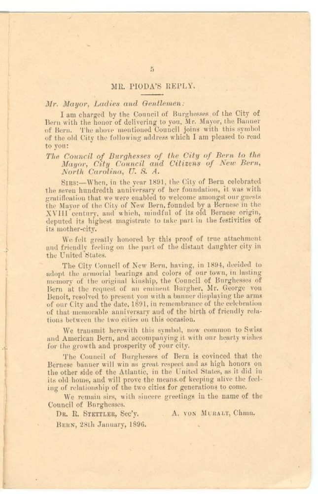 The City Council of New Bern, having, in 1894, decided to adopt the armorial bearings and colors of our town, in lasting memory of the original kinship, the Council of Burghesses of Bern at the request of an eminent Burgher, Mr. George von Benoit, resolved to present you with a banner displaying the arms of our City and the date, 1891, in remembrance of the celebration of that memorable anniversary and of the birth of friendly relations between the two cities on this occasion.