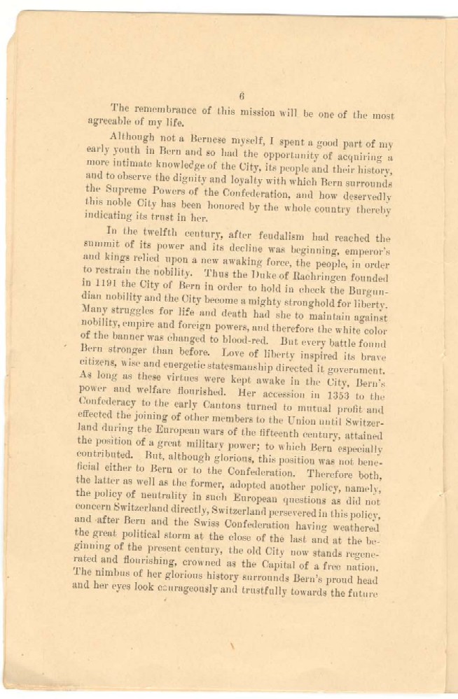Although not a Bernese myself, I spent a good part of my early youth in Bern and so had the opportunity of acquiring a more intimate knowledge of the City, its people and their history, and to observe the dignity and loyalty with which Bern surrounds the Supreme Powers of the Confederation, and how deservedly this noble City has been honored by the whole country thereby indicating its trust in her.