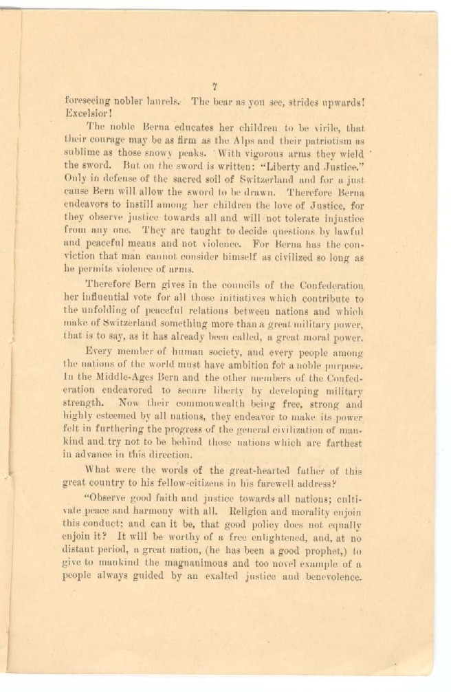 The noble Berna educates her children to be virile, that their courage may be as firm as the Alps and their patriotism as sublime as those snowy peaks. With vigorous arms they wield the sword. But on the sword is written: “Liberty and Justice.” Only in defense of the sacred soil of Switzerland and for a just cause Bern will allow the sword to be drawn. Therefore Berna endeavors to instill among her children the love of Justice, for they observe justice towards all and will not tolerate injustice from any one. They are taught to decide questions by lawful and peaceful means and not violence. For Berna has the conviction that man cannot consider himself as civilized so long as he permits violence of arms.